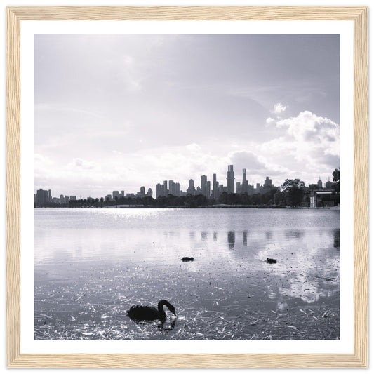 Melbourne skyline, Albert Park lake (B&W) - Premium Matte Paper Wooden Framed Poster