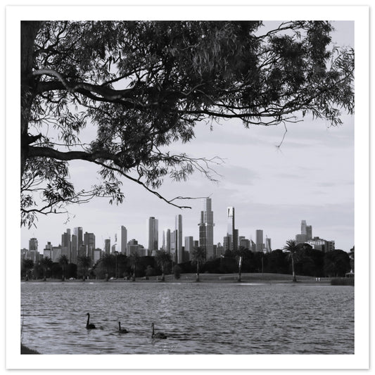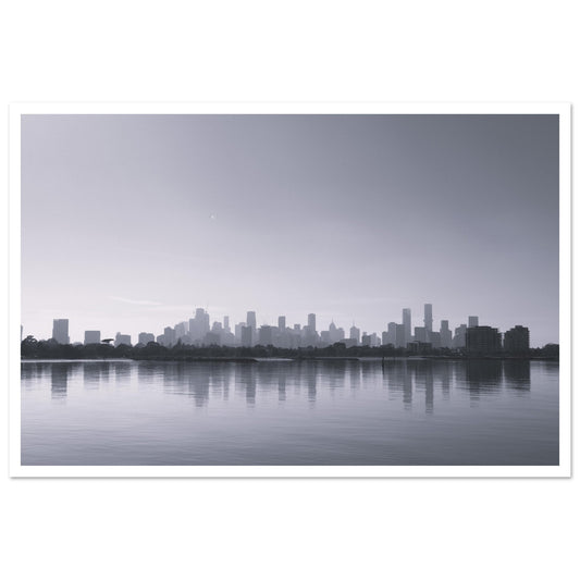 Melbourne skyline at dusk, Albert Park Lake (B&W) - Premium Matte Paper Poster