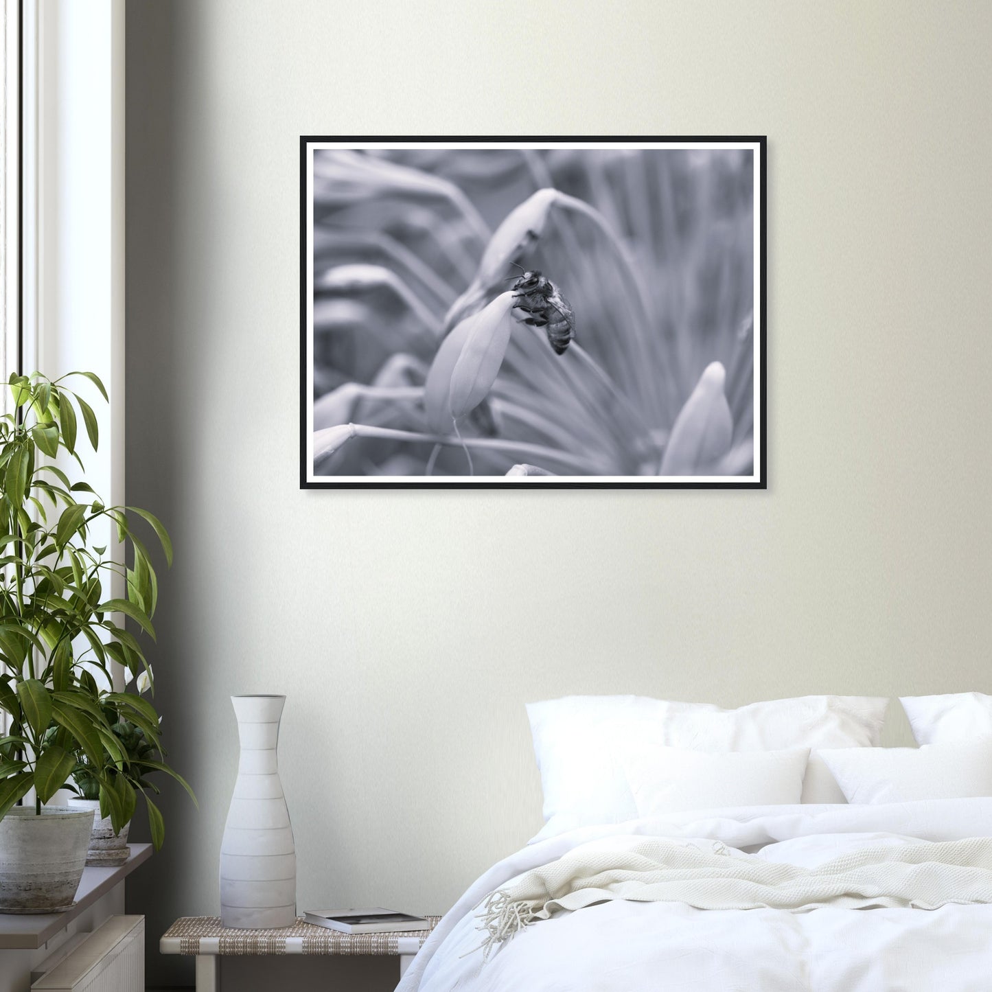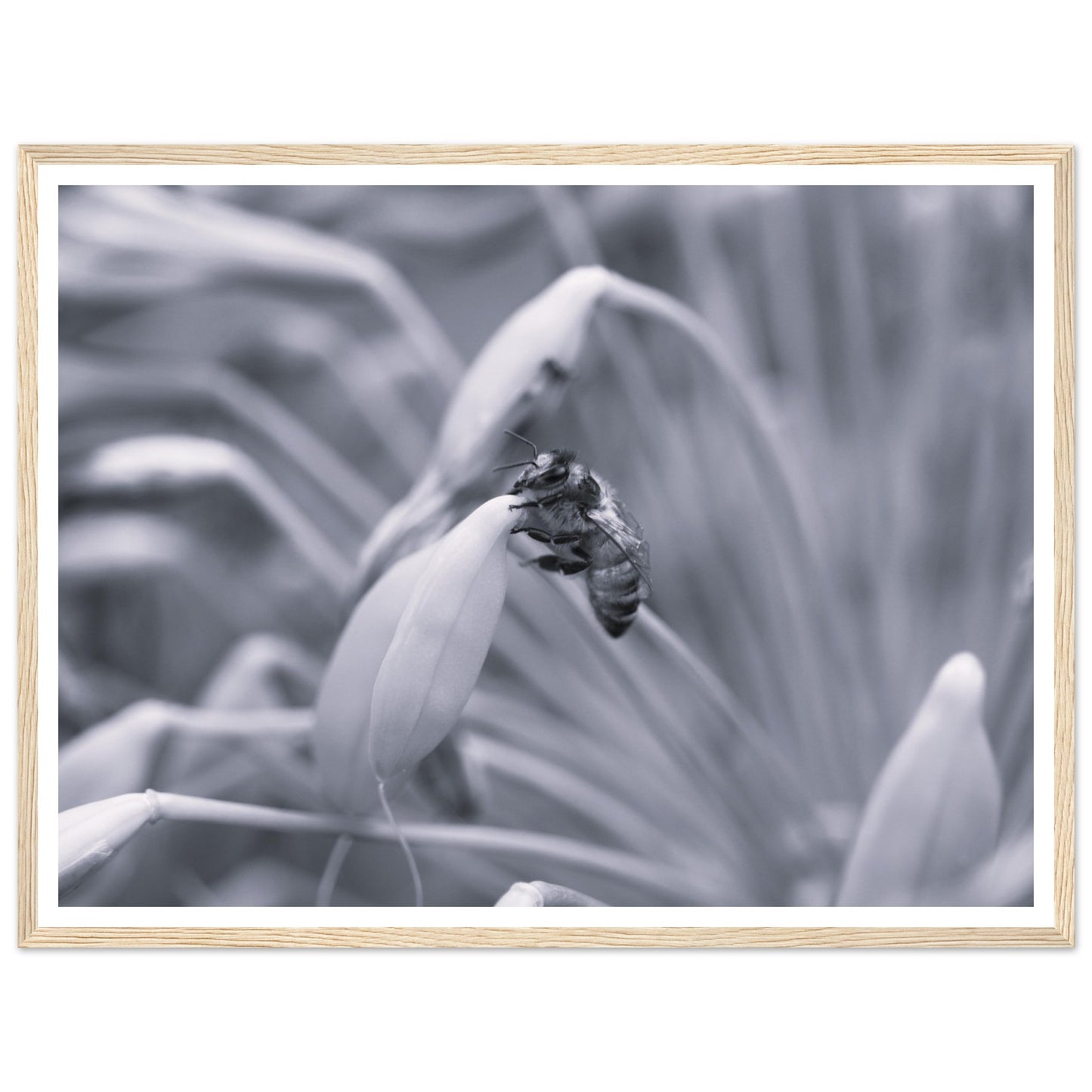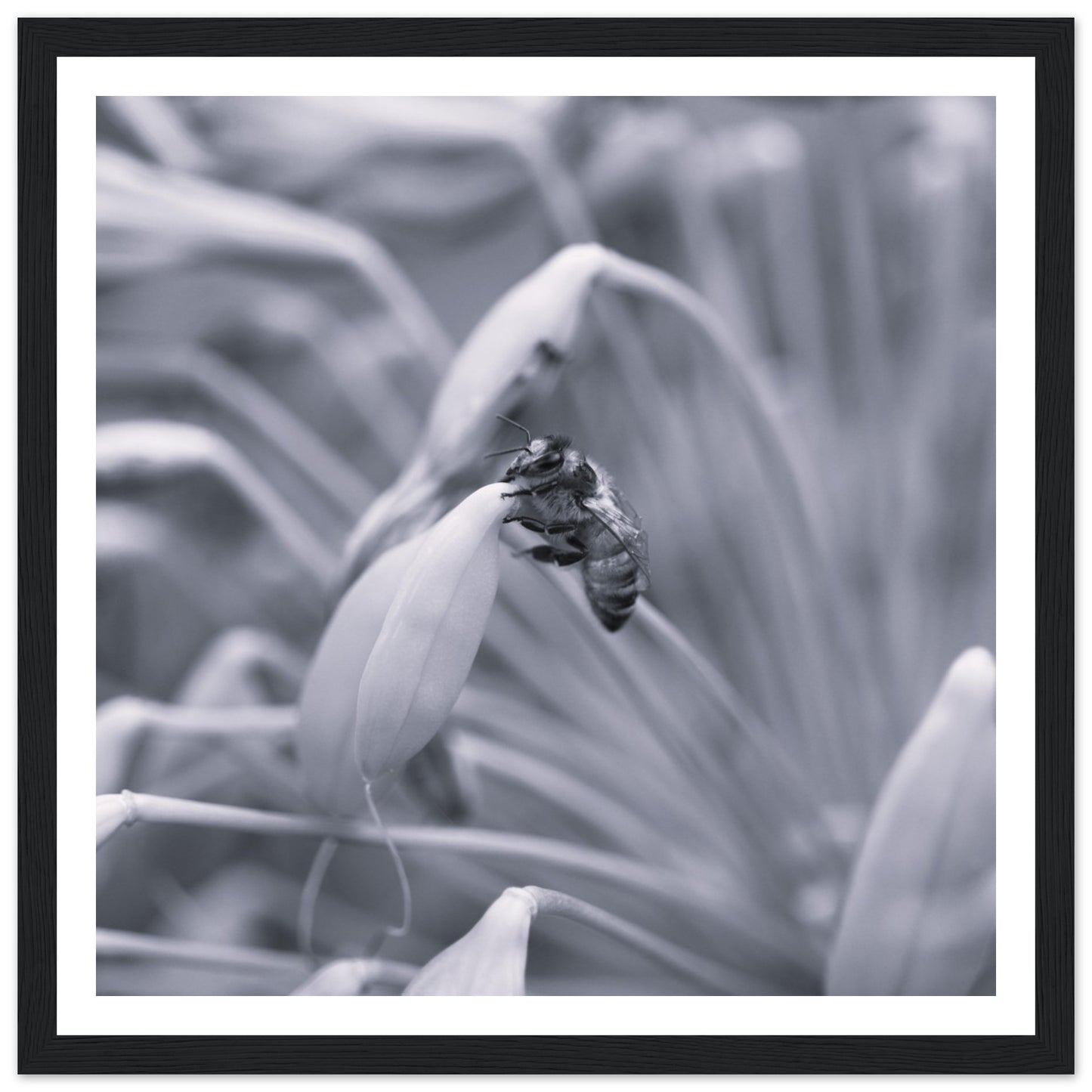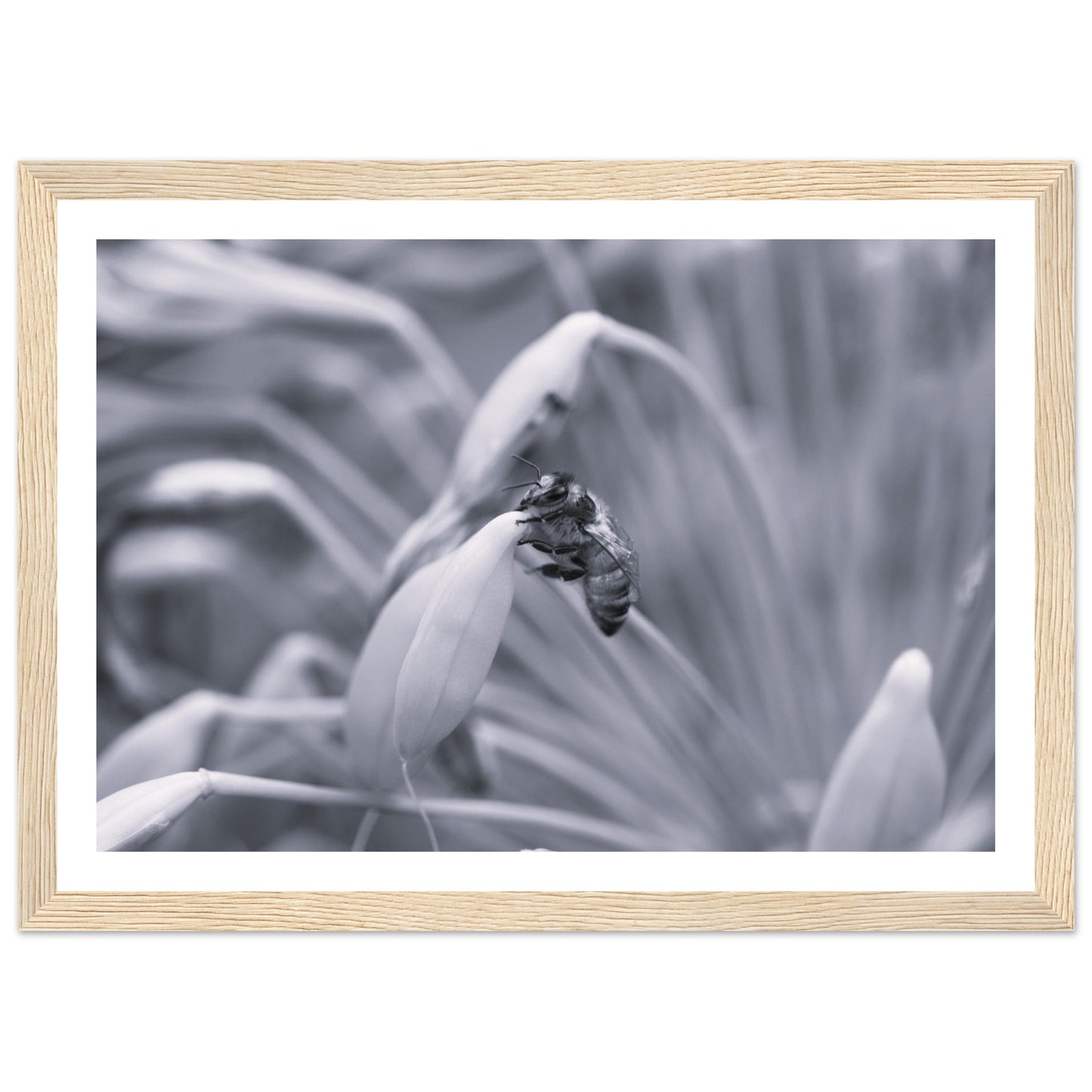 Bee in summer garden - Black & White - Premium matte paper poster with wooden frame