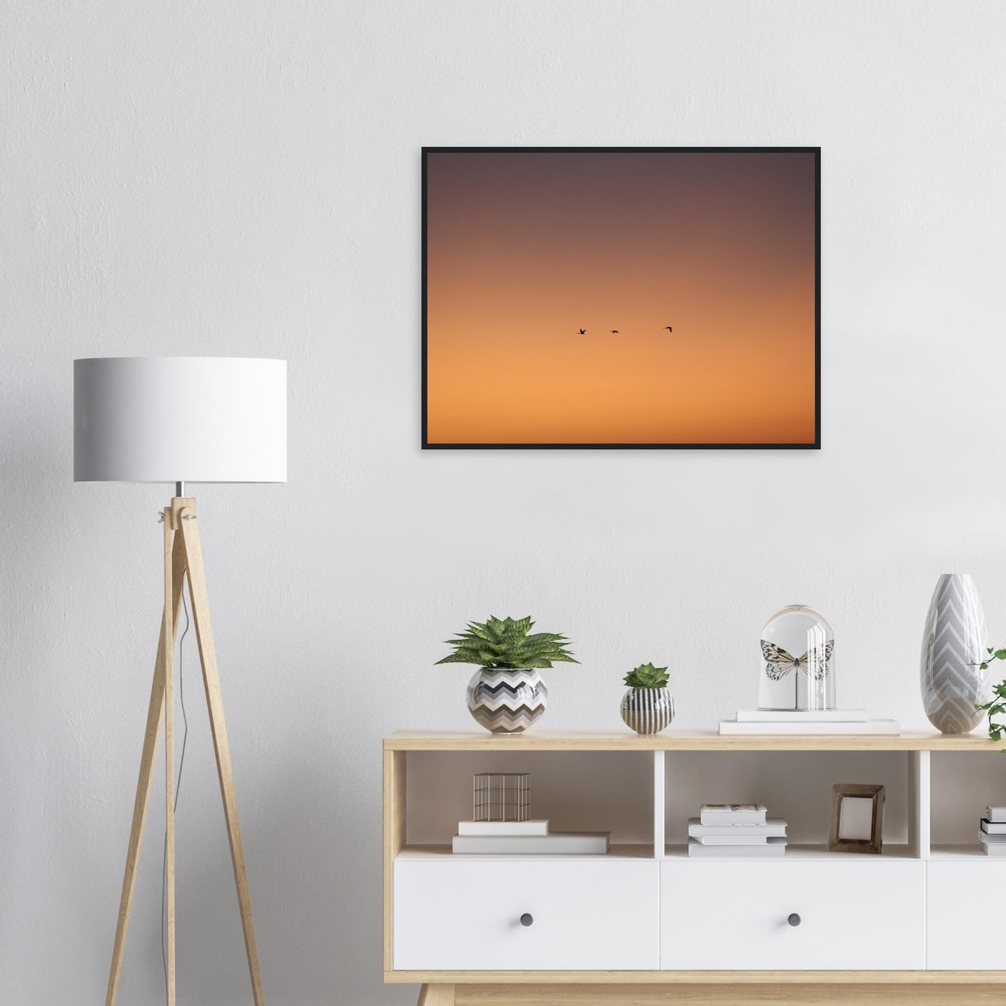 Birds flying into the sunset - Premium matte paper poster with wooden frame