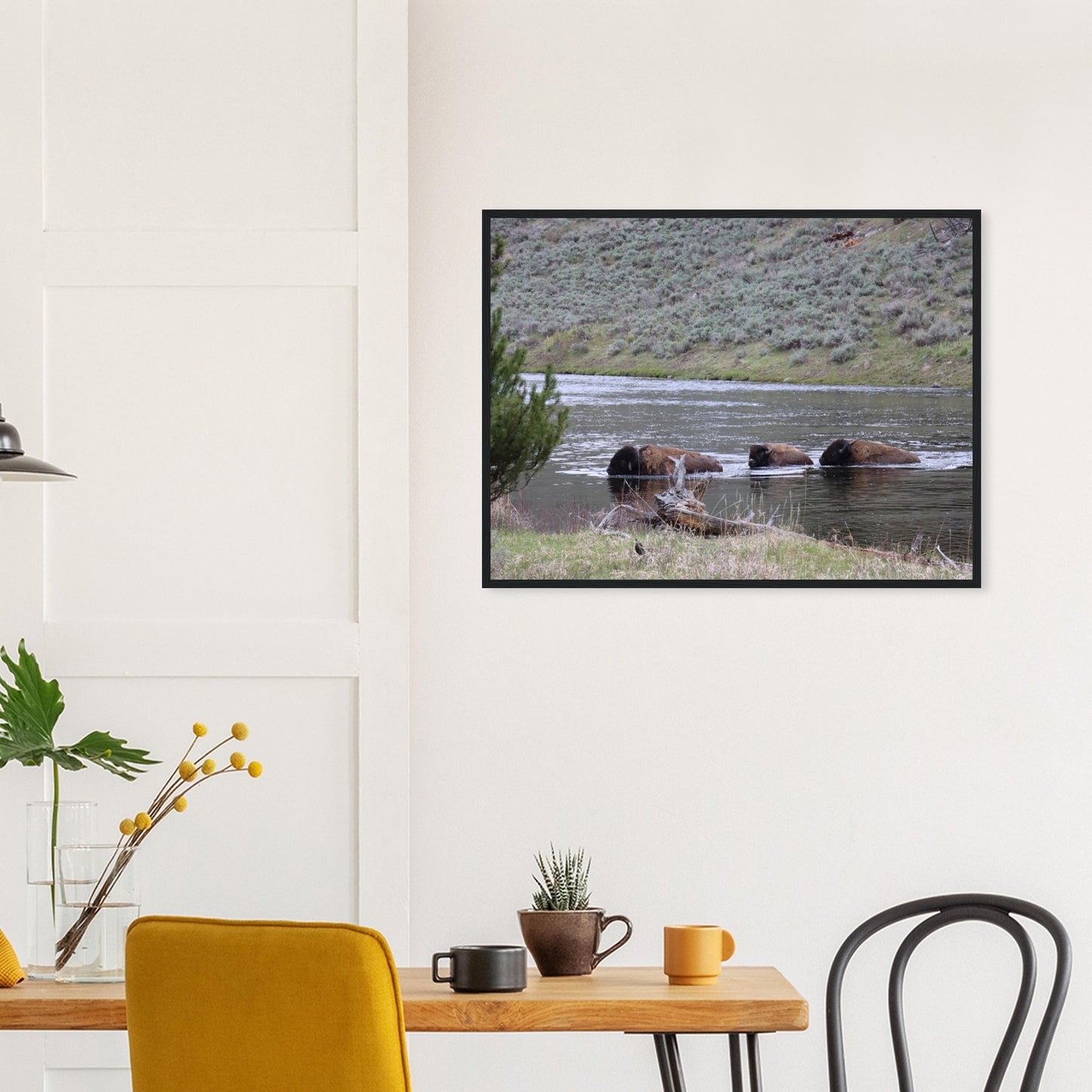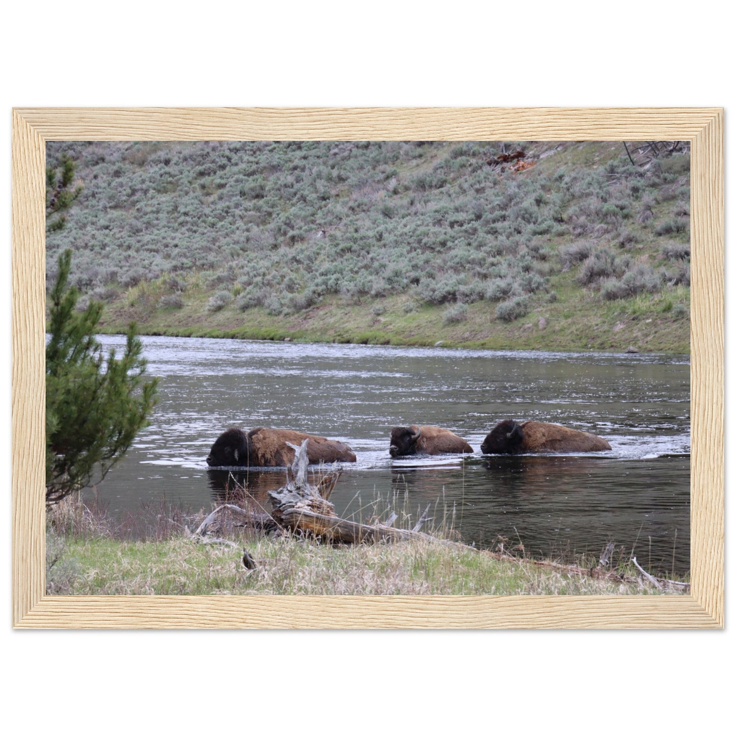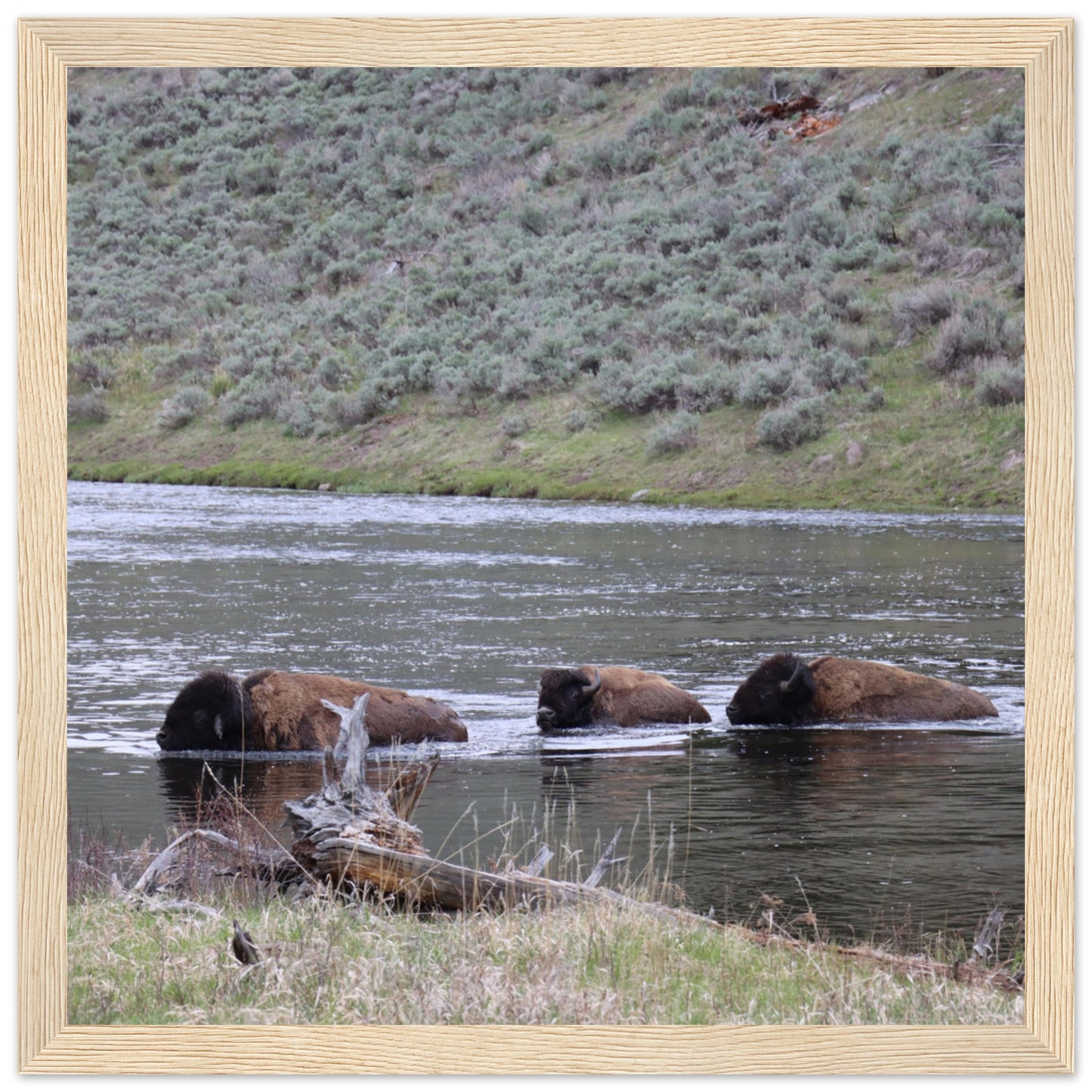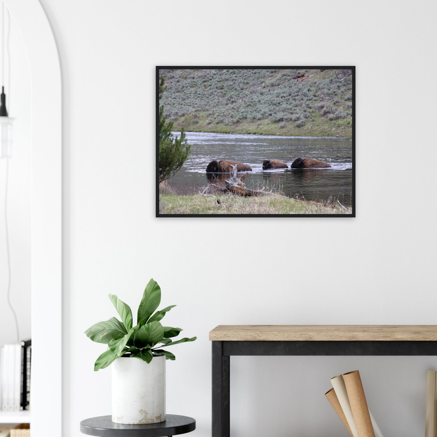 Bisons crossing the river - Premium matte paper poster with wooden frame