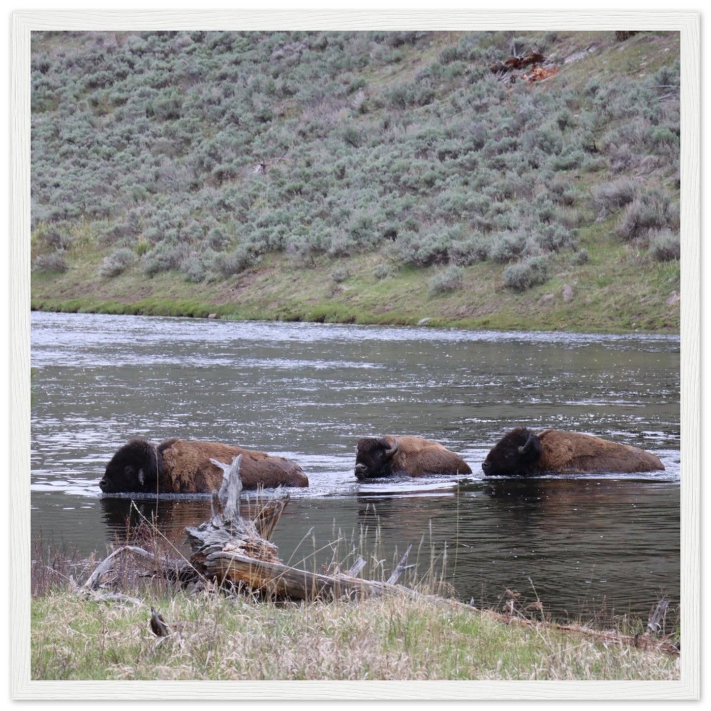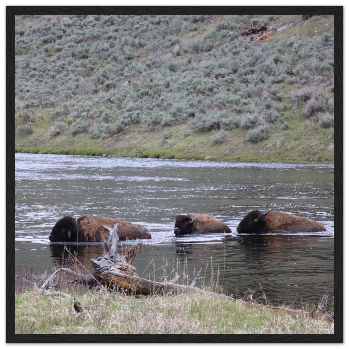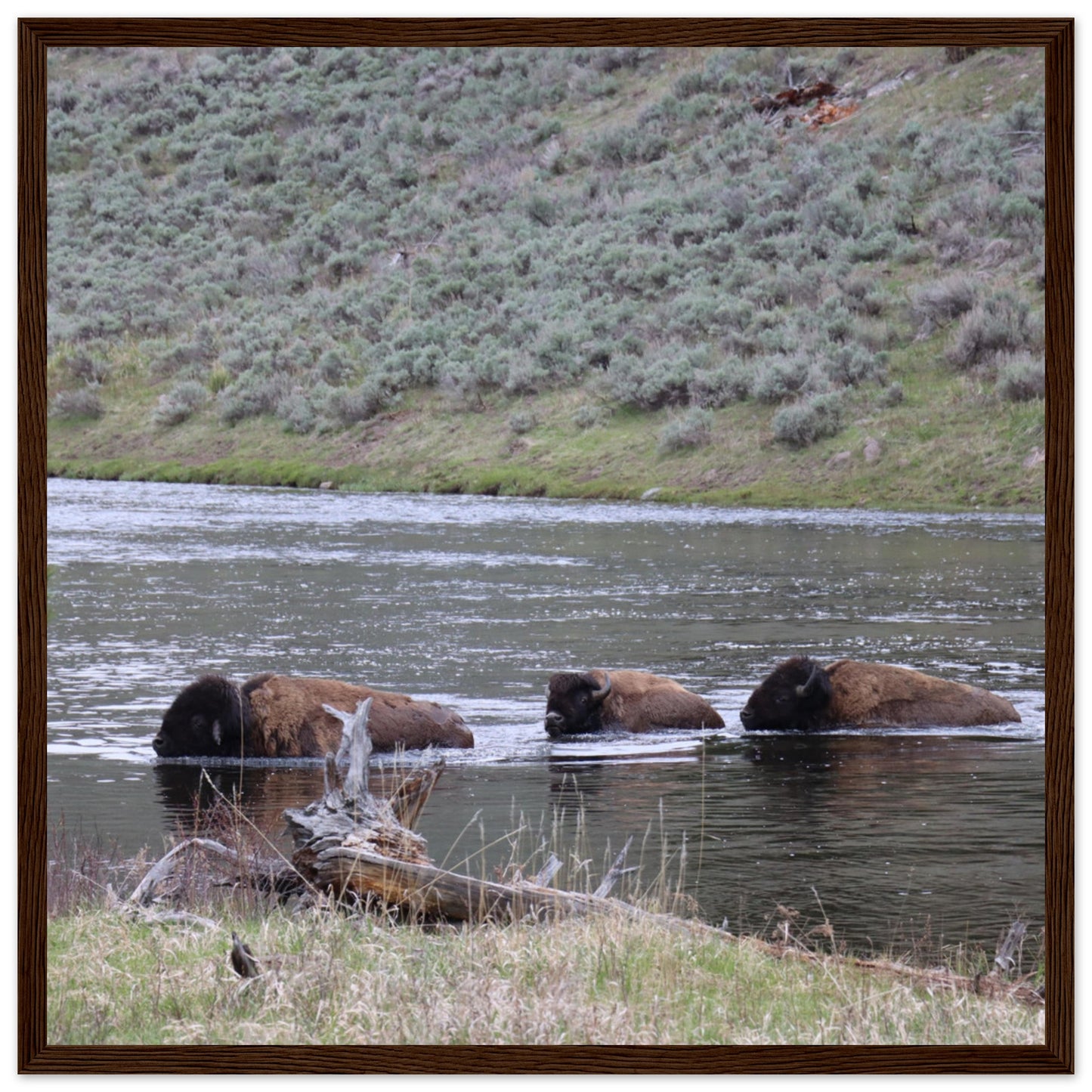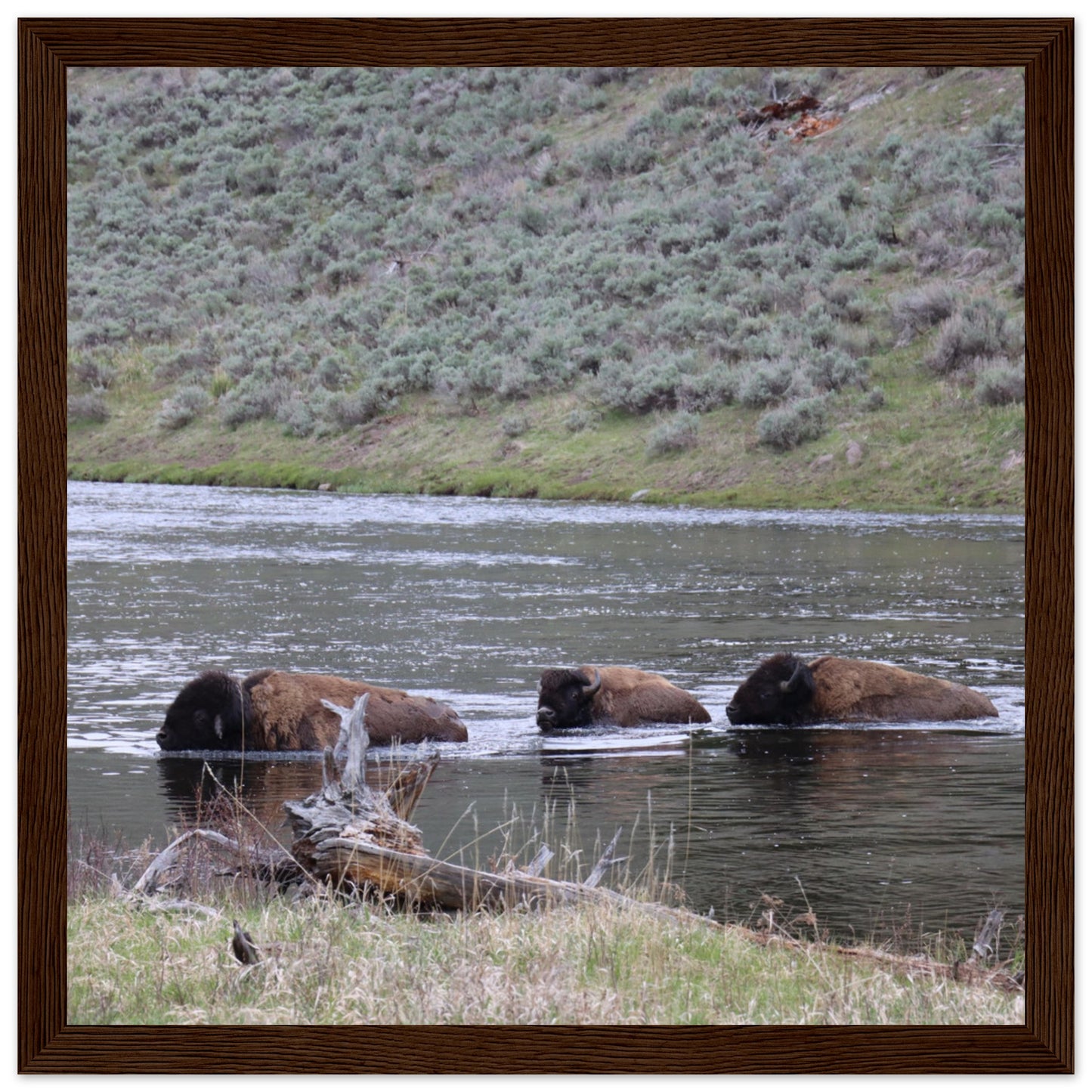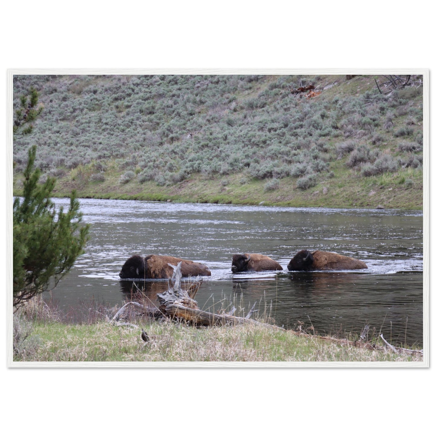 Bisons crossing the river - Premium matte paper poster with wooden frame