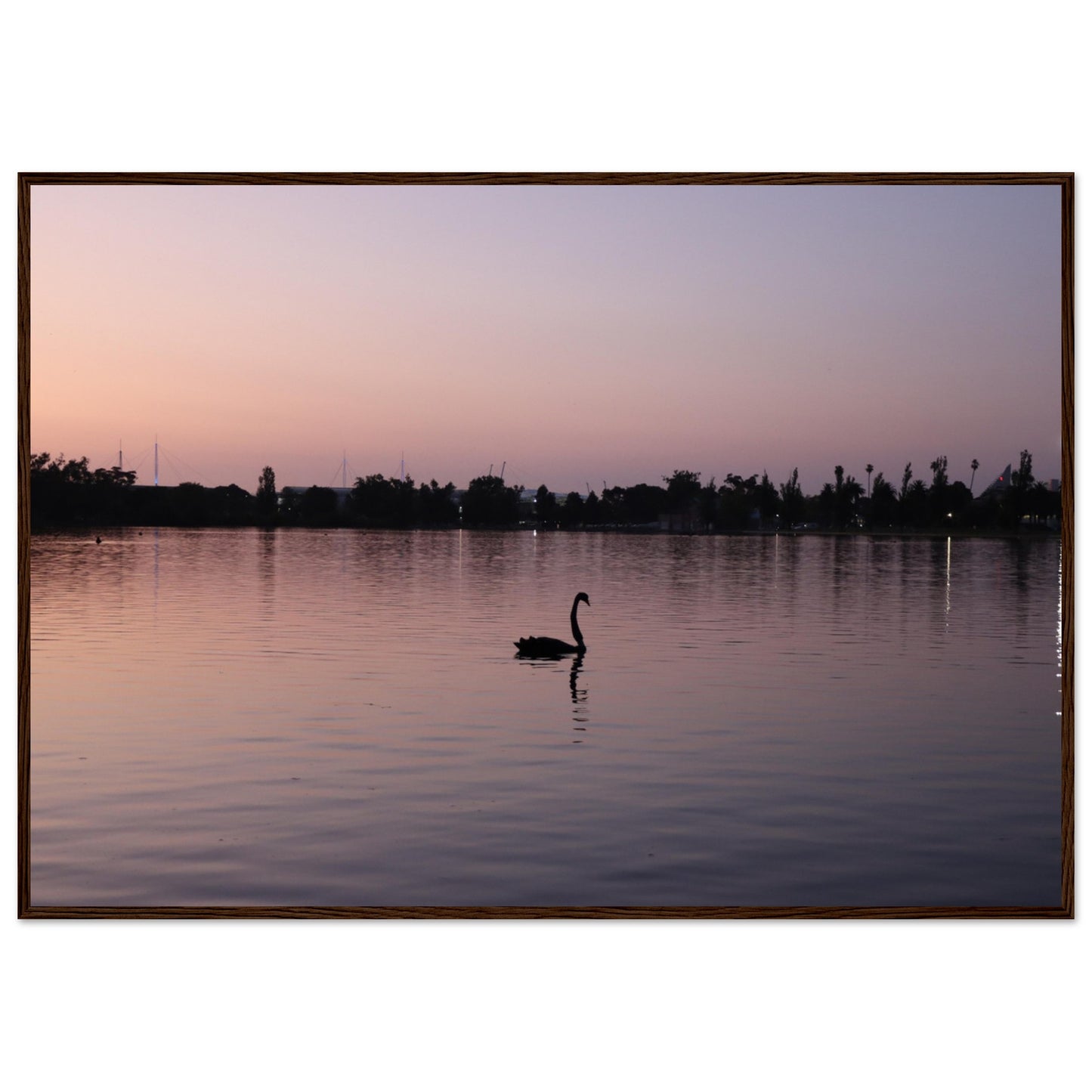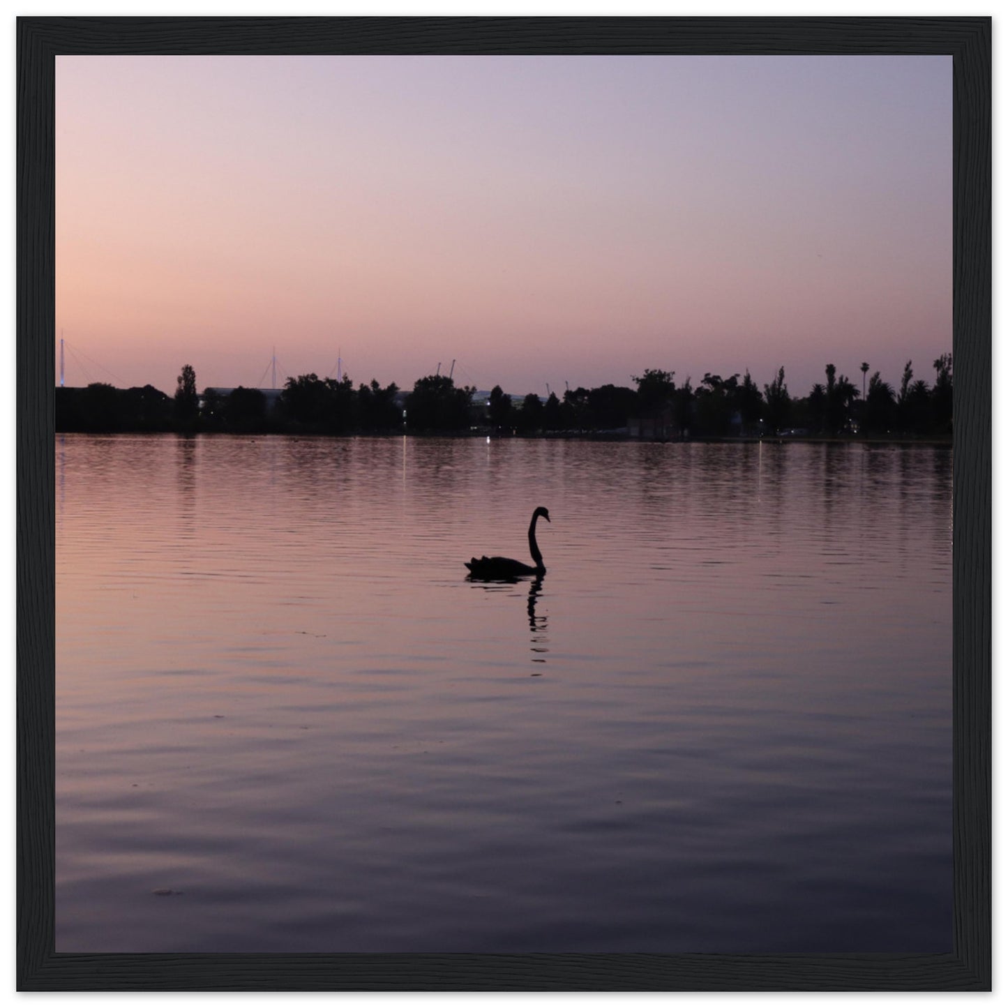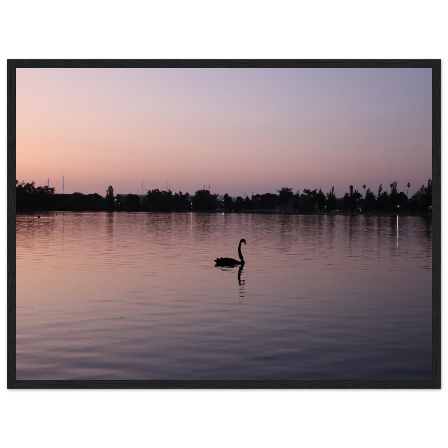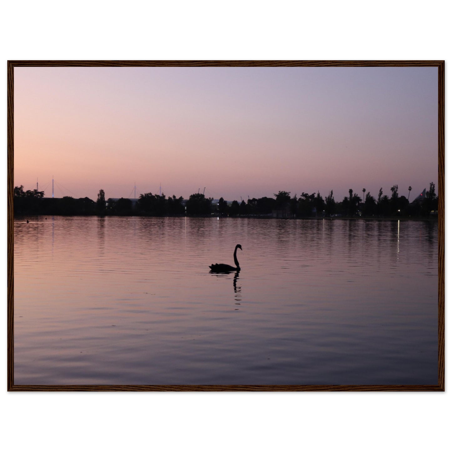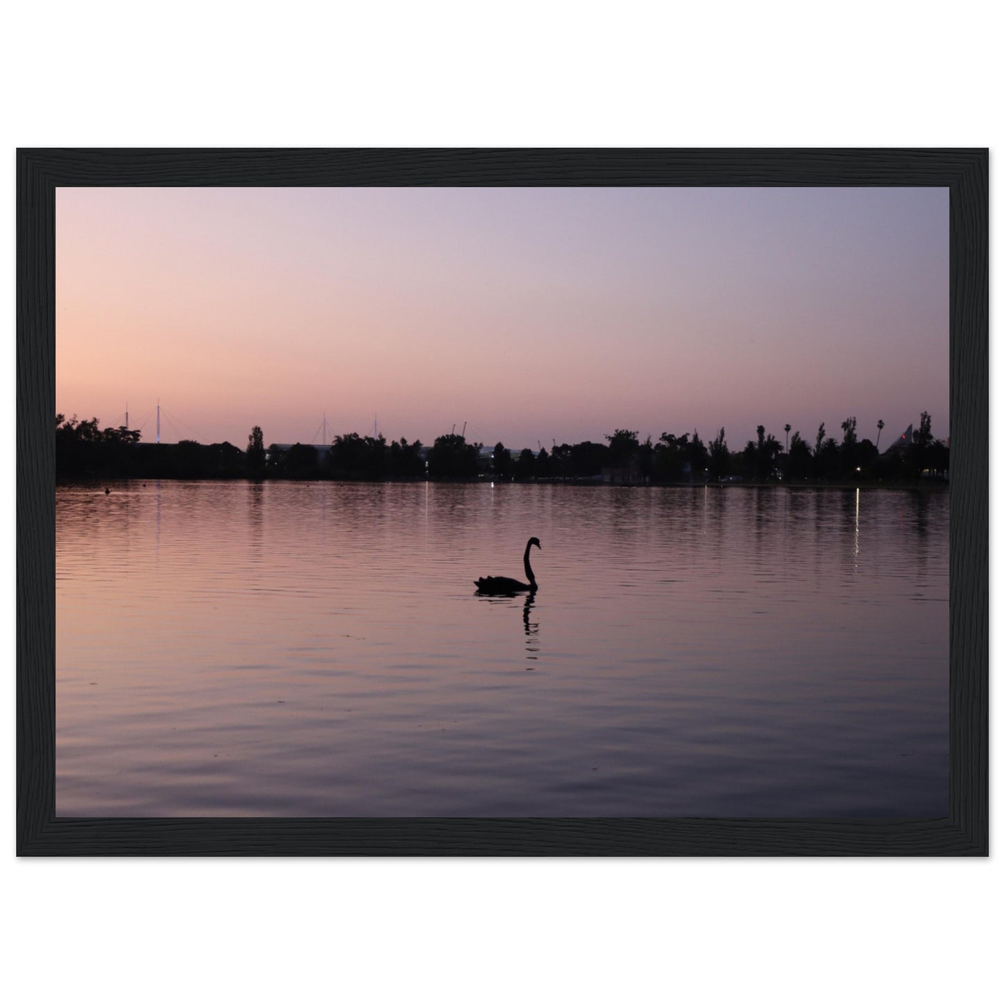 Black swan on evening lake - Premium Matte Paper Wooden Framed Poster