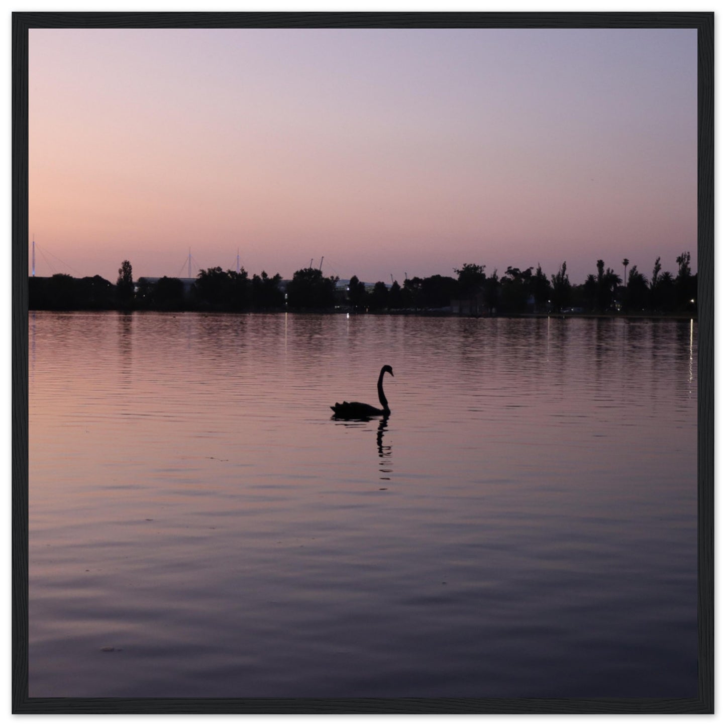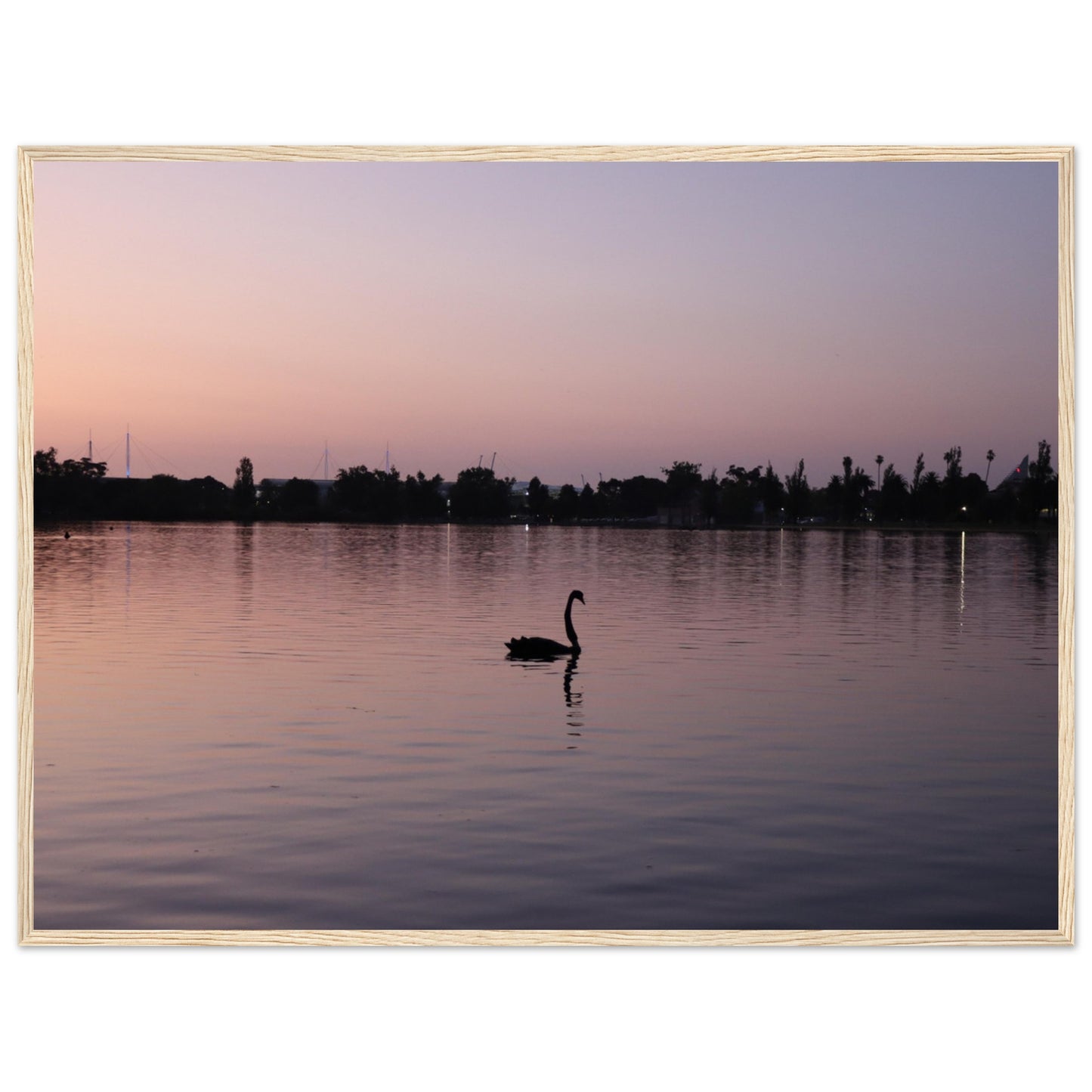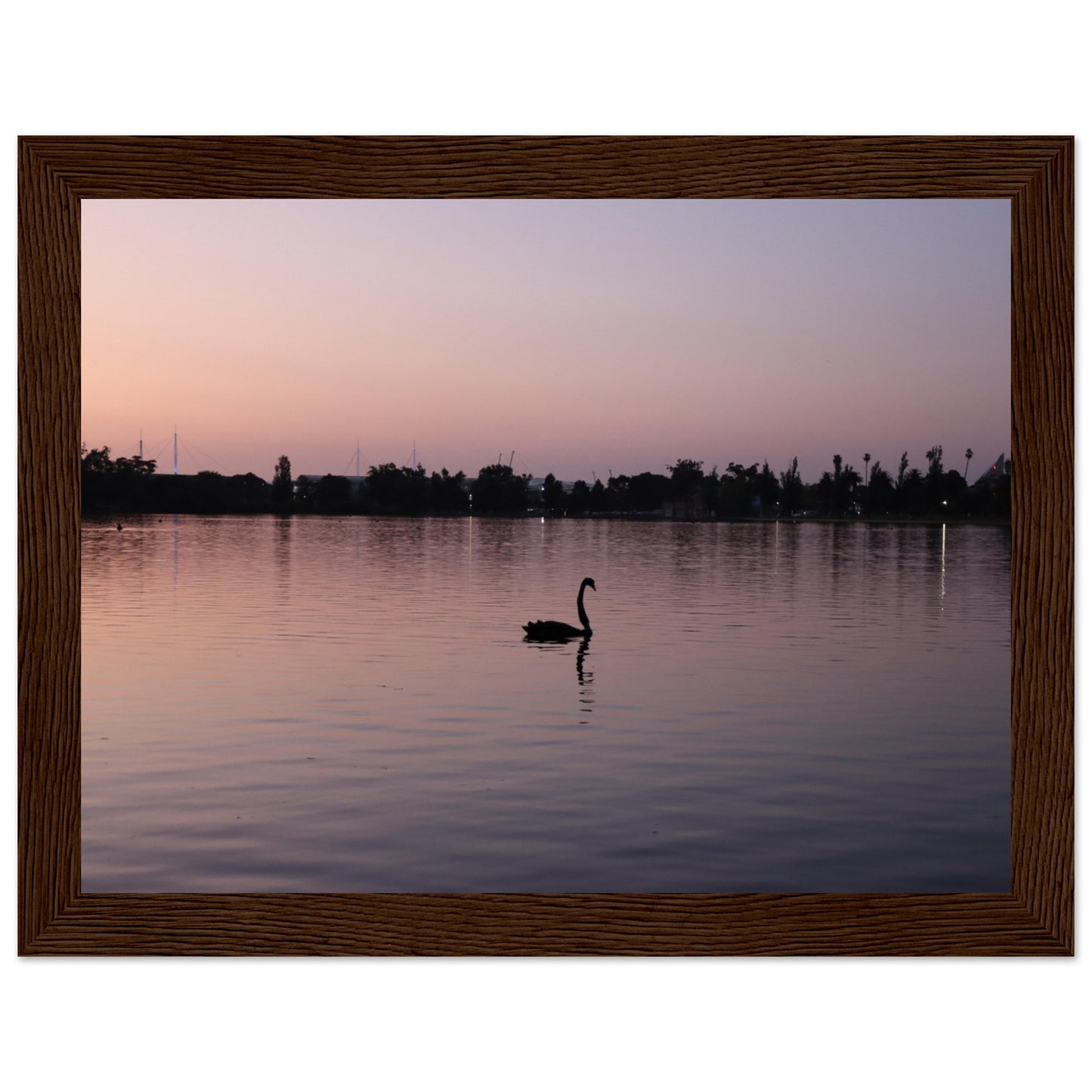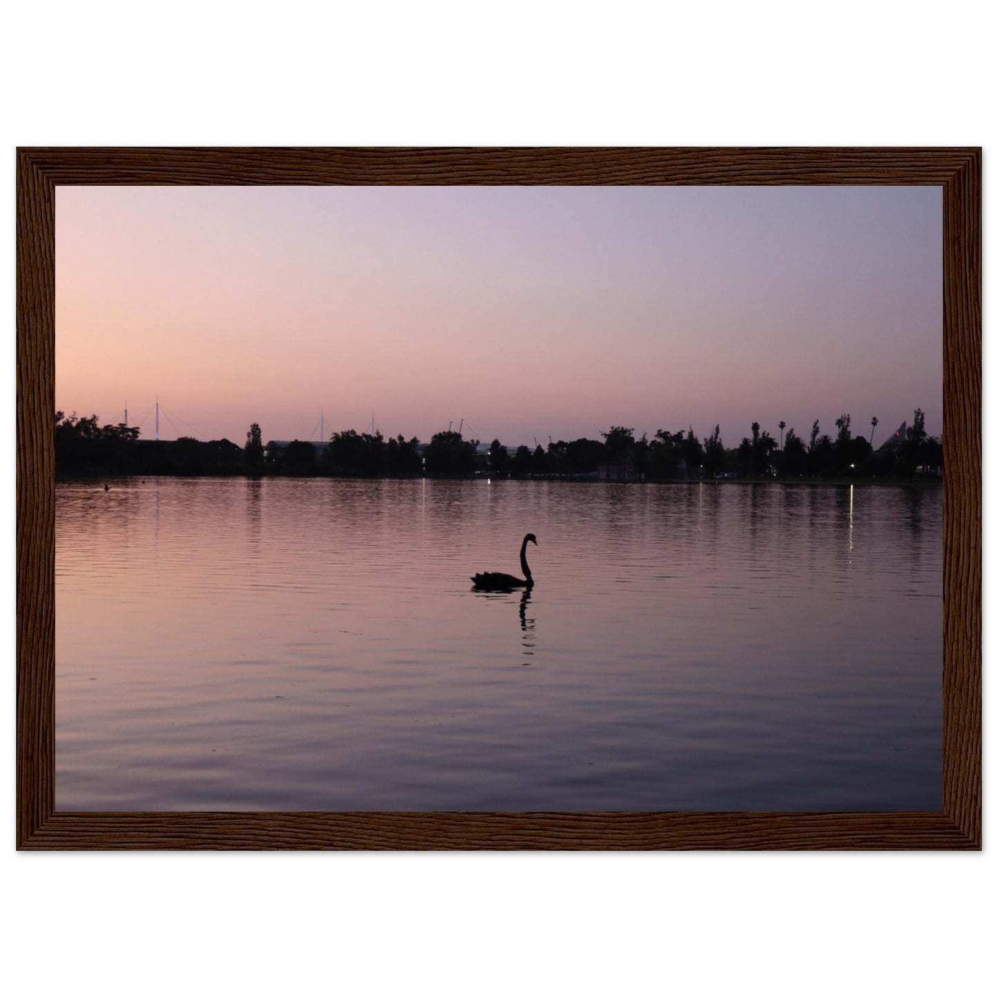 Black swan on evening lake - Premium Matte Paper Wooden Framed Poster