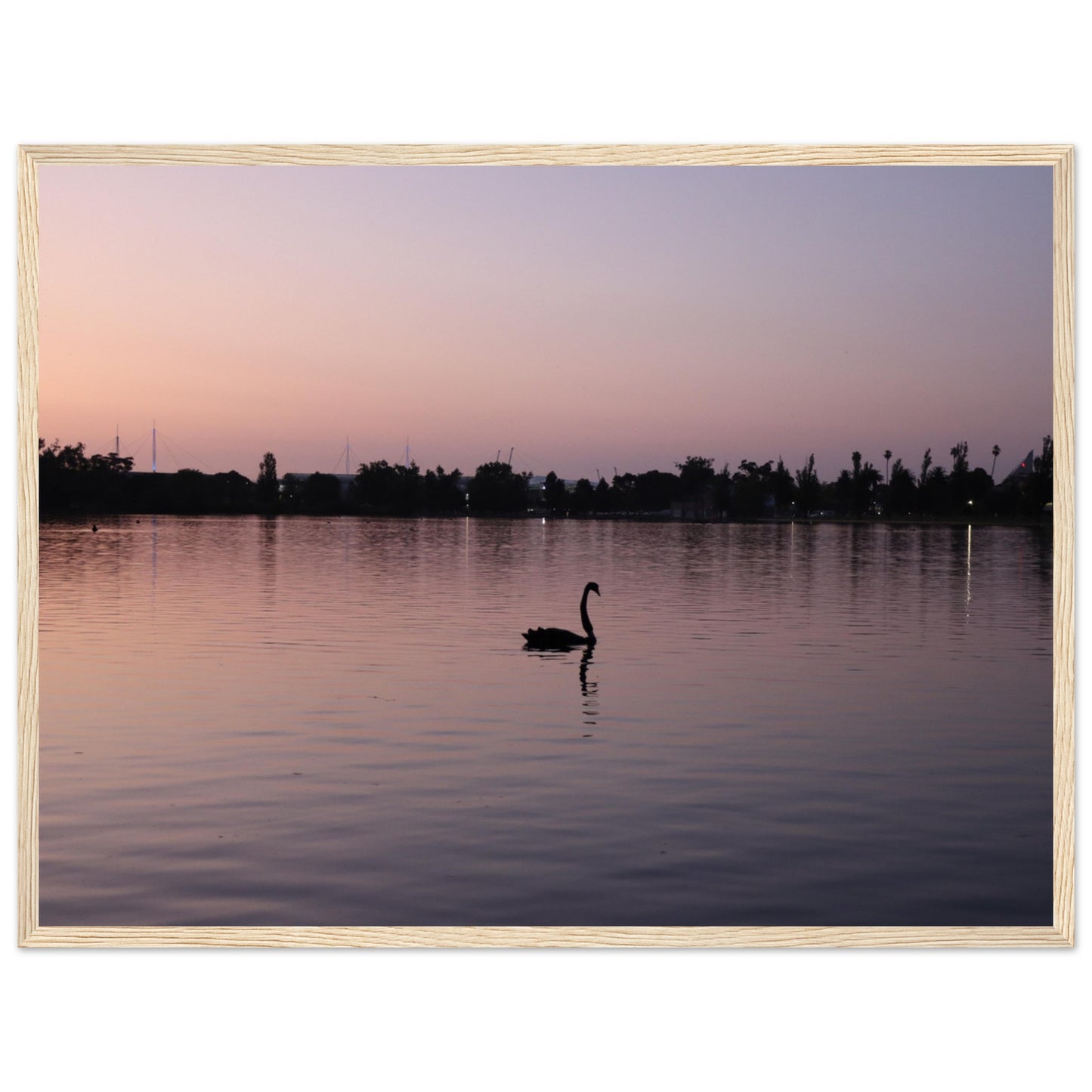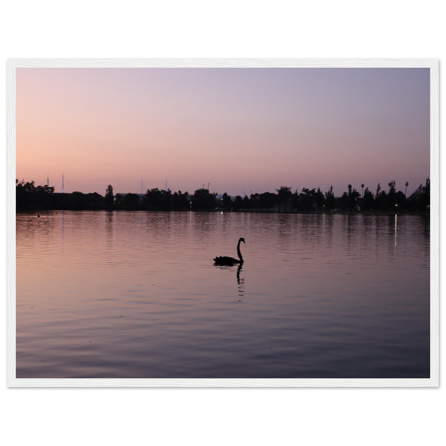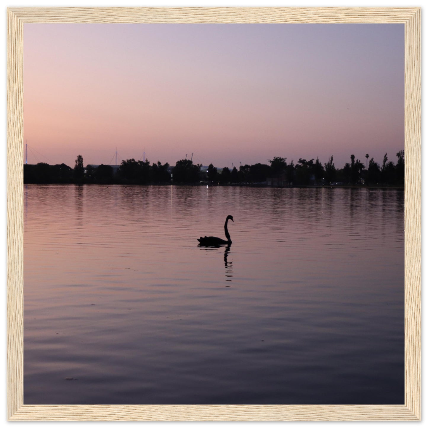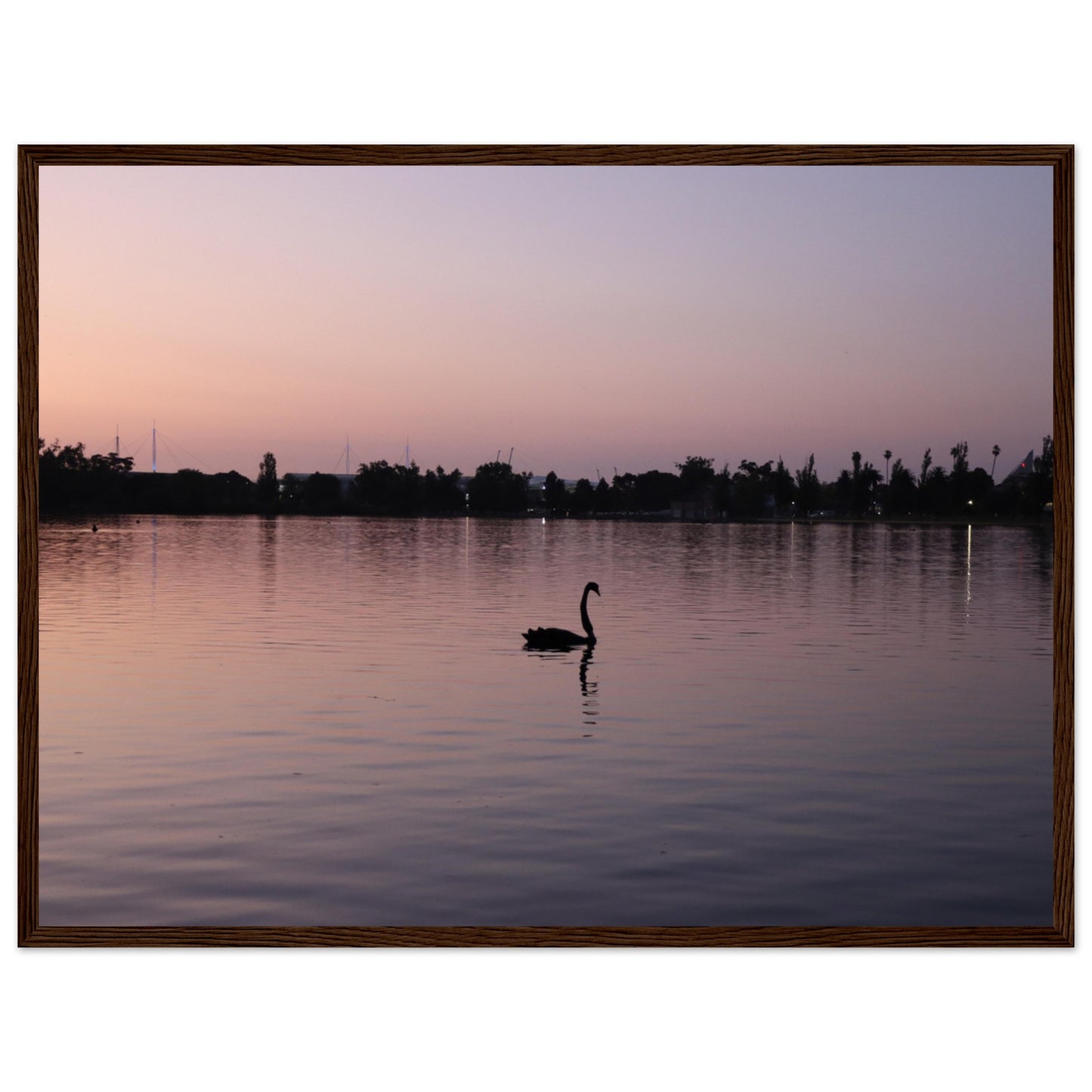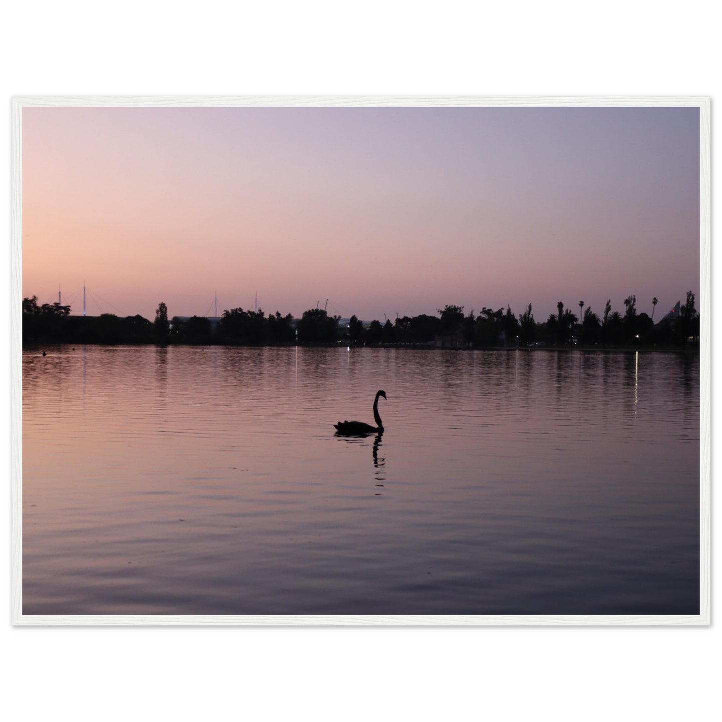 Black swan on evening lake - Premium Matte Paper Wooden Framed Poster