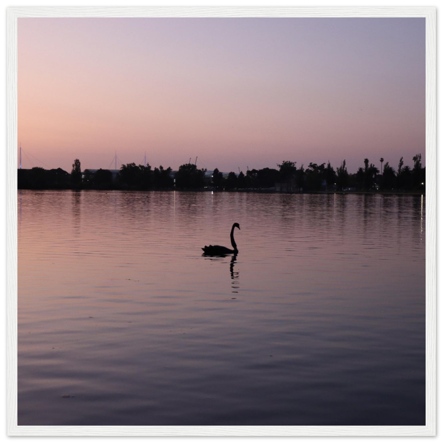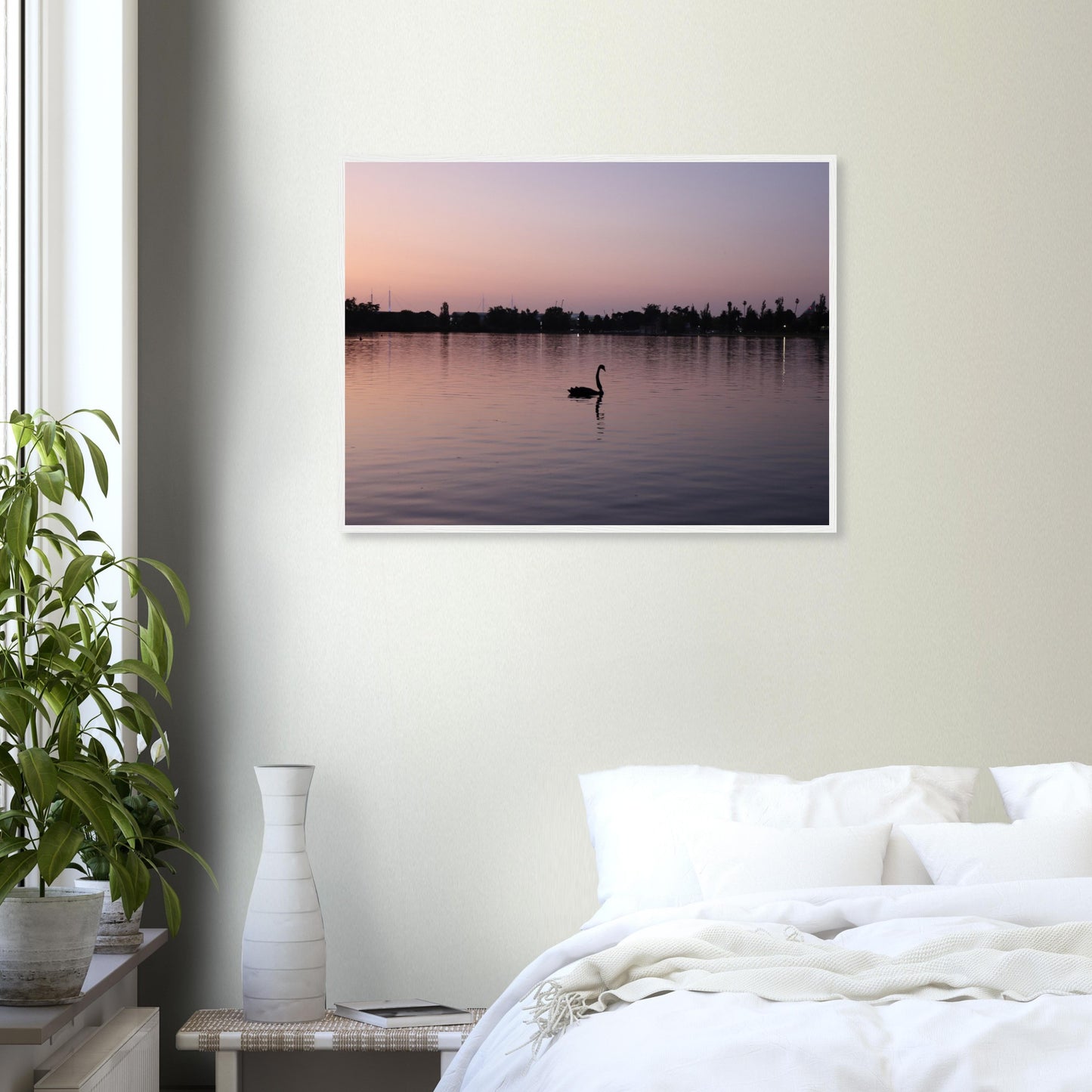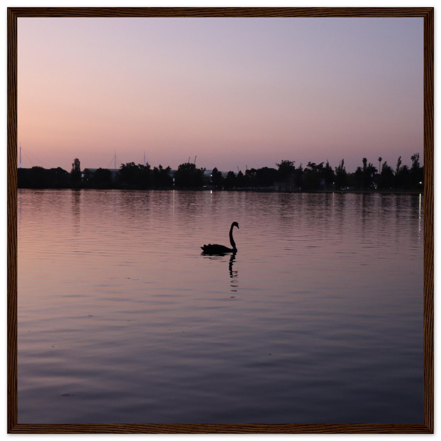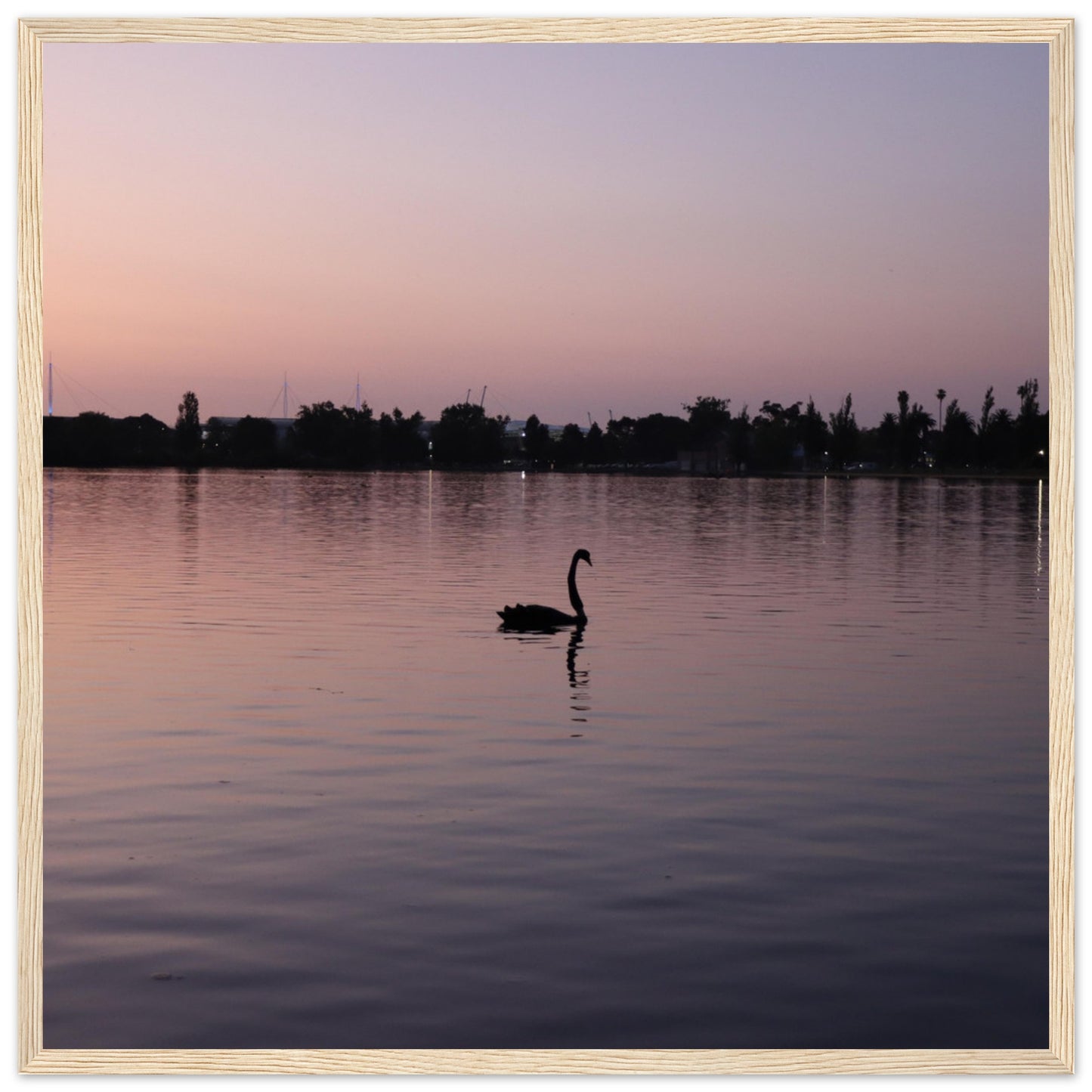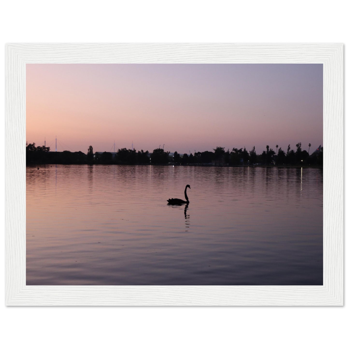 Black swan on evening lake - Premium Matte Paper Wooden Framed Poster