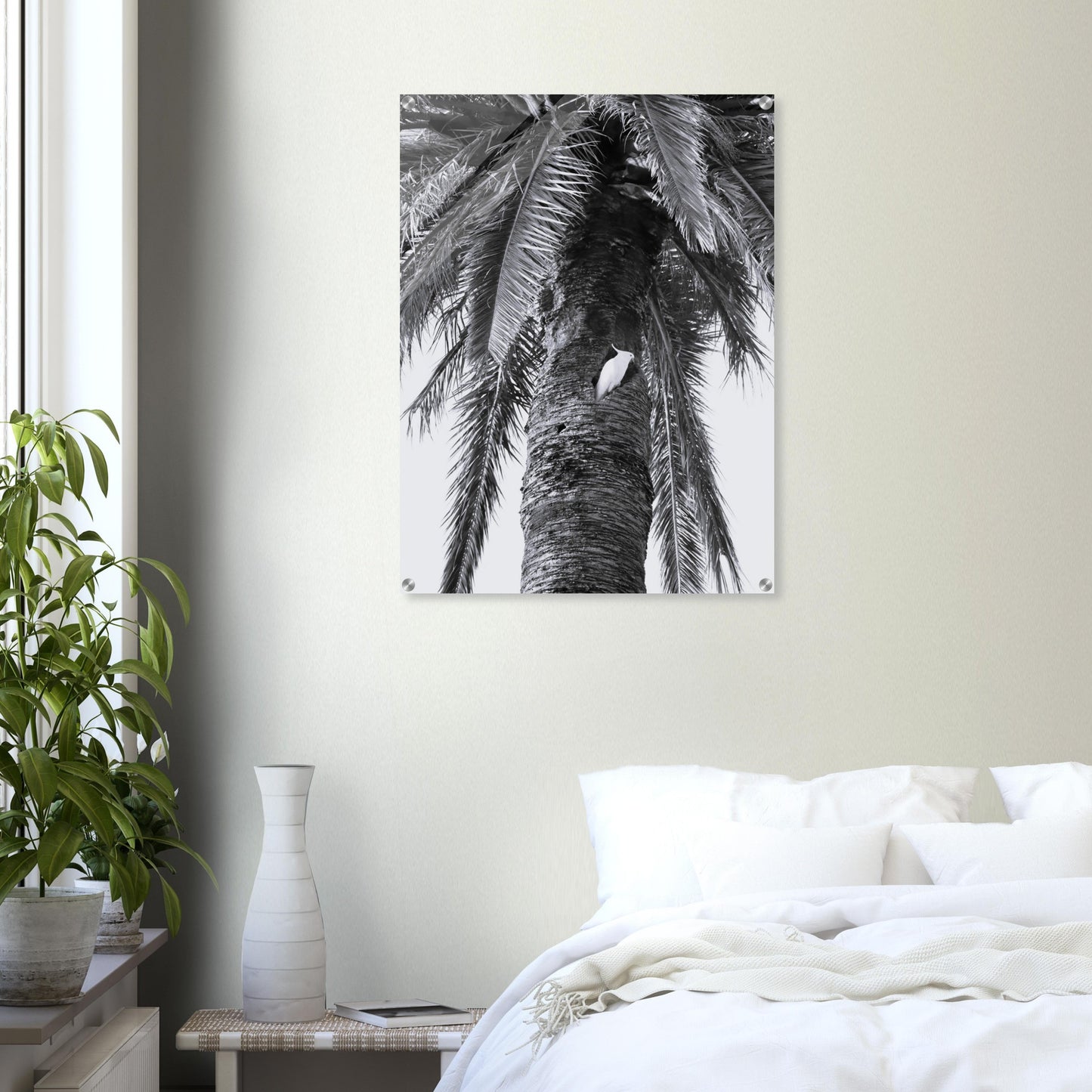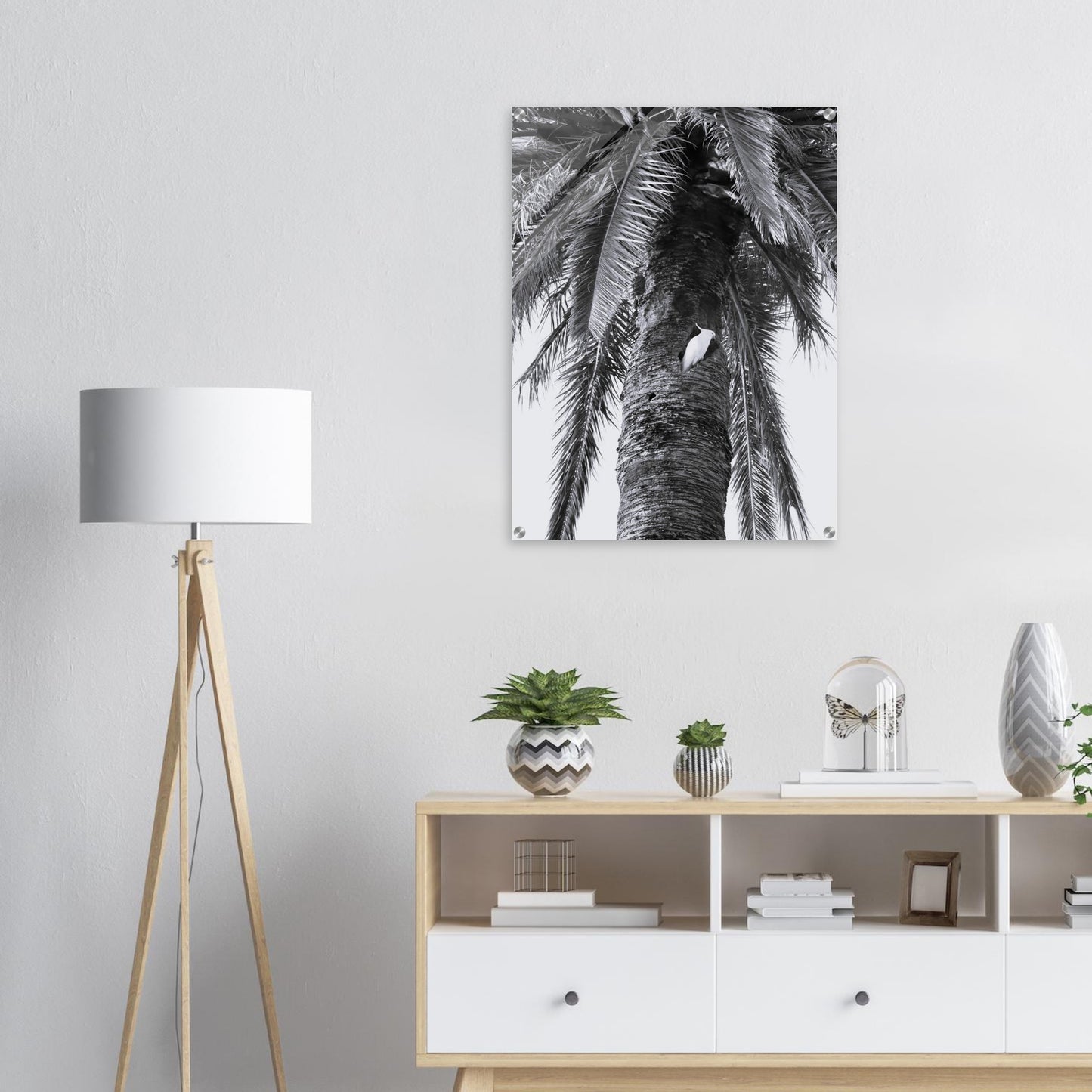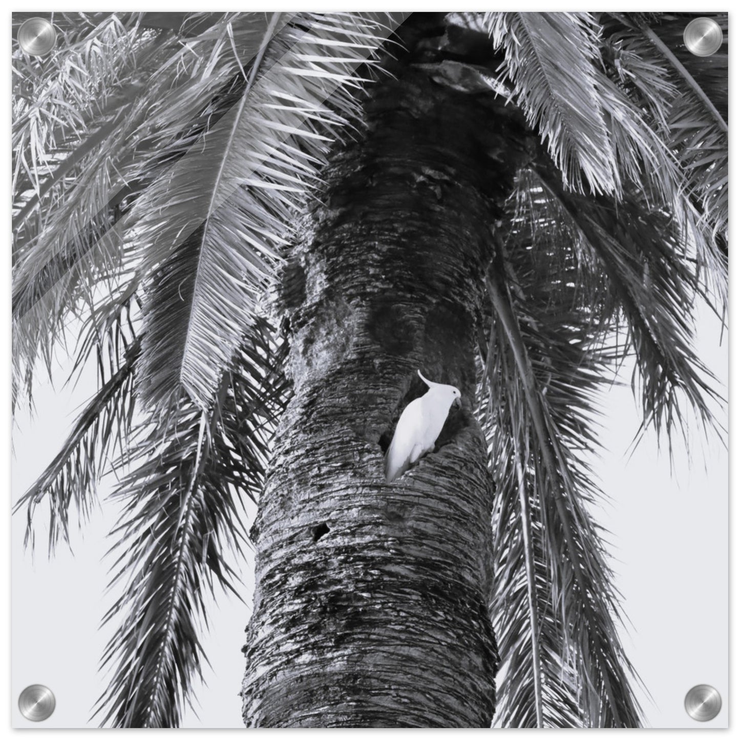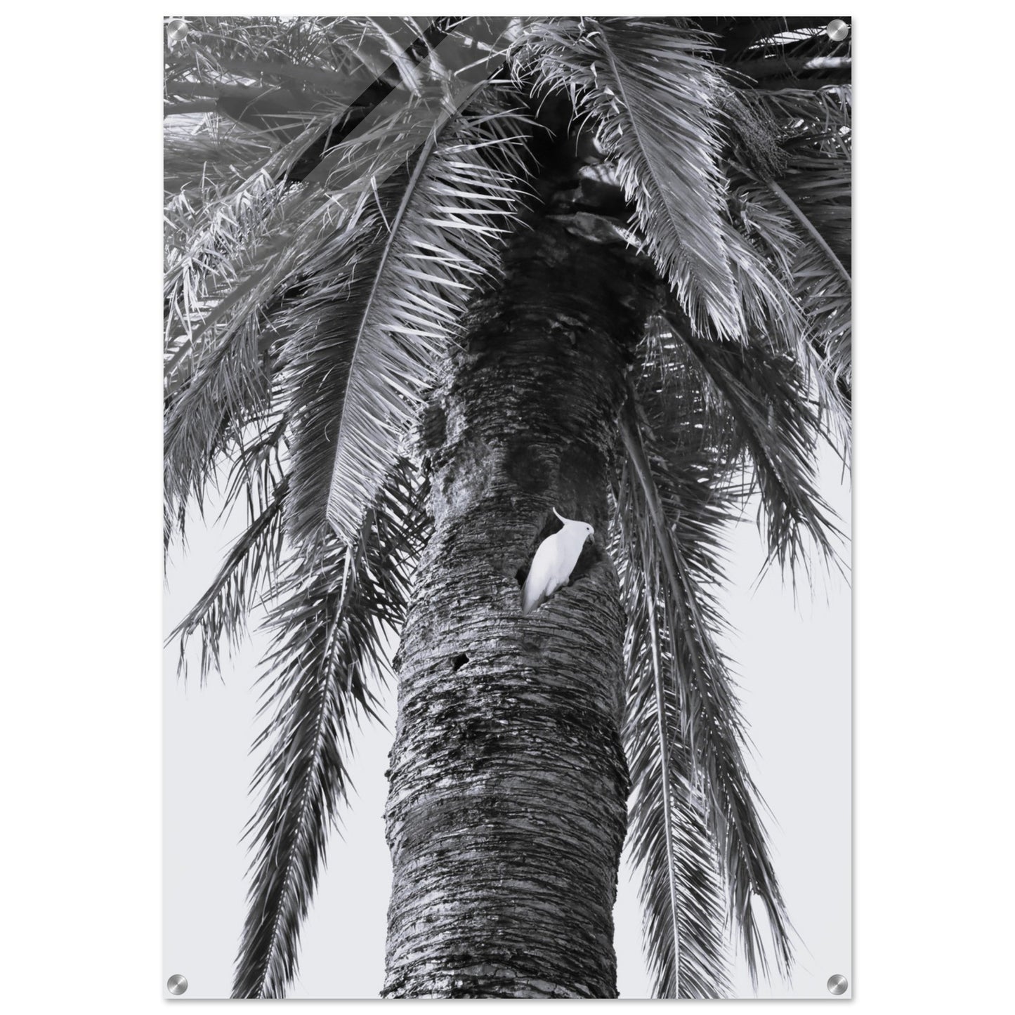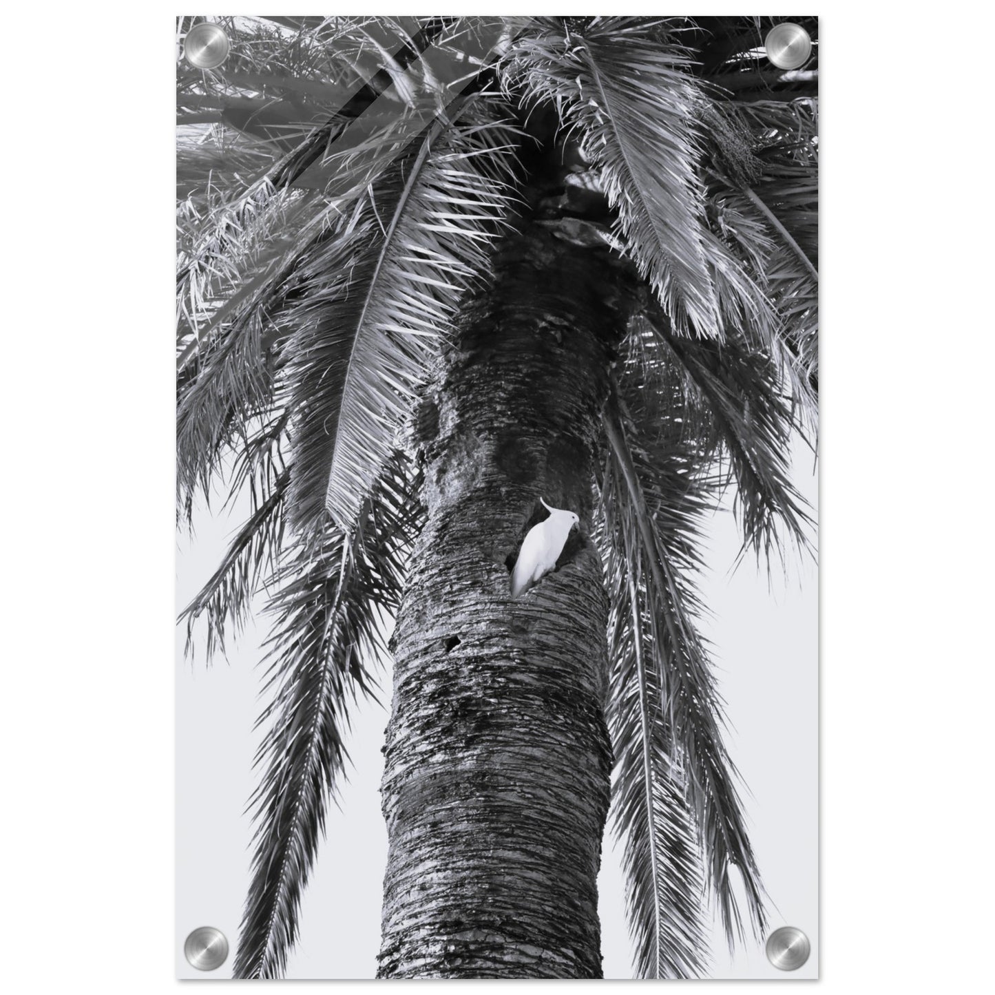 Cockatoo in palm tree - Black & White - Acrylic print (lightweight, shatterproof, and temperature-resistant, making them easy to mount on your walls.)