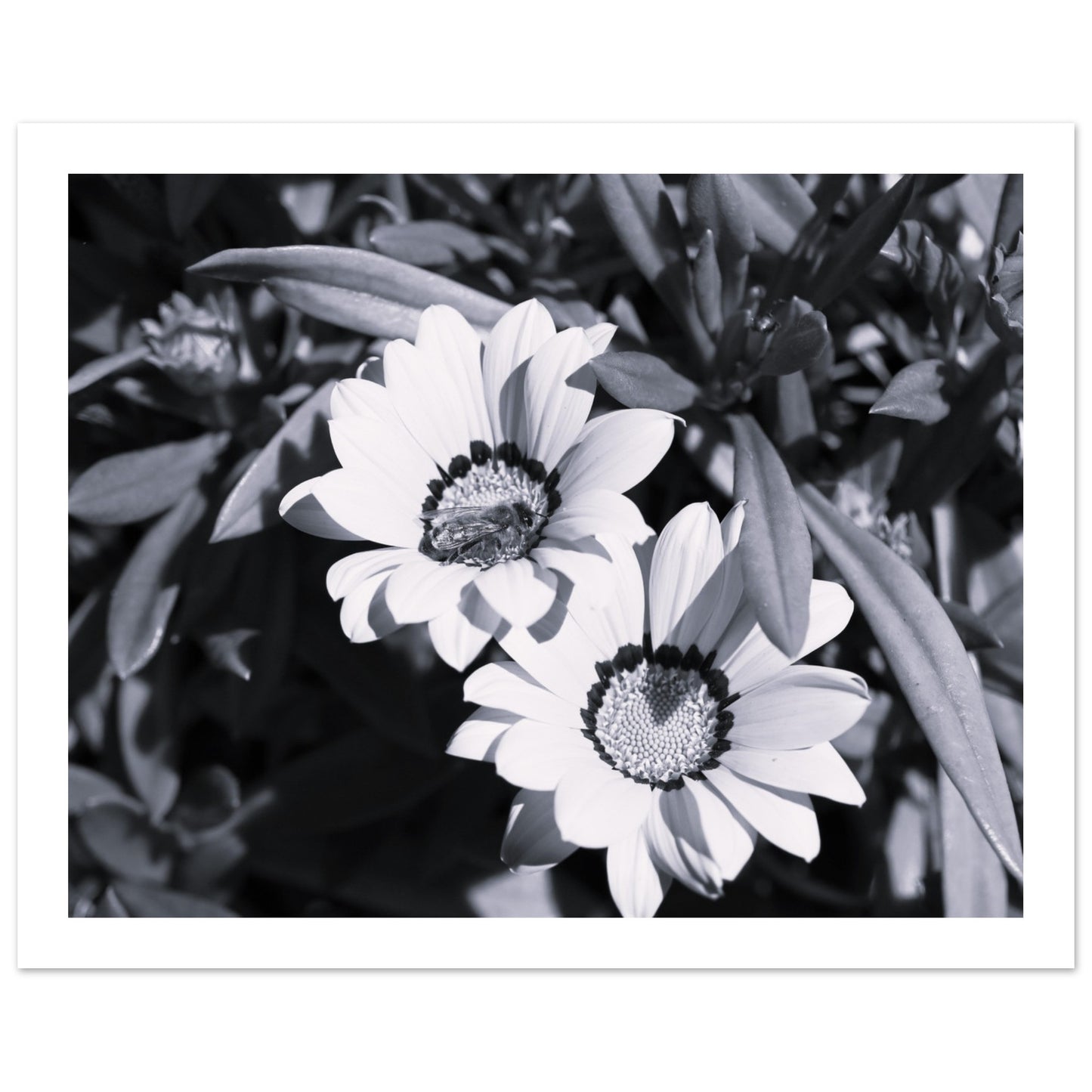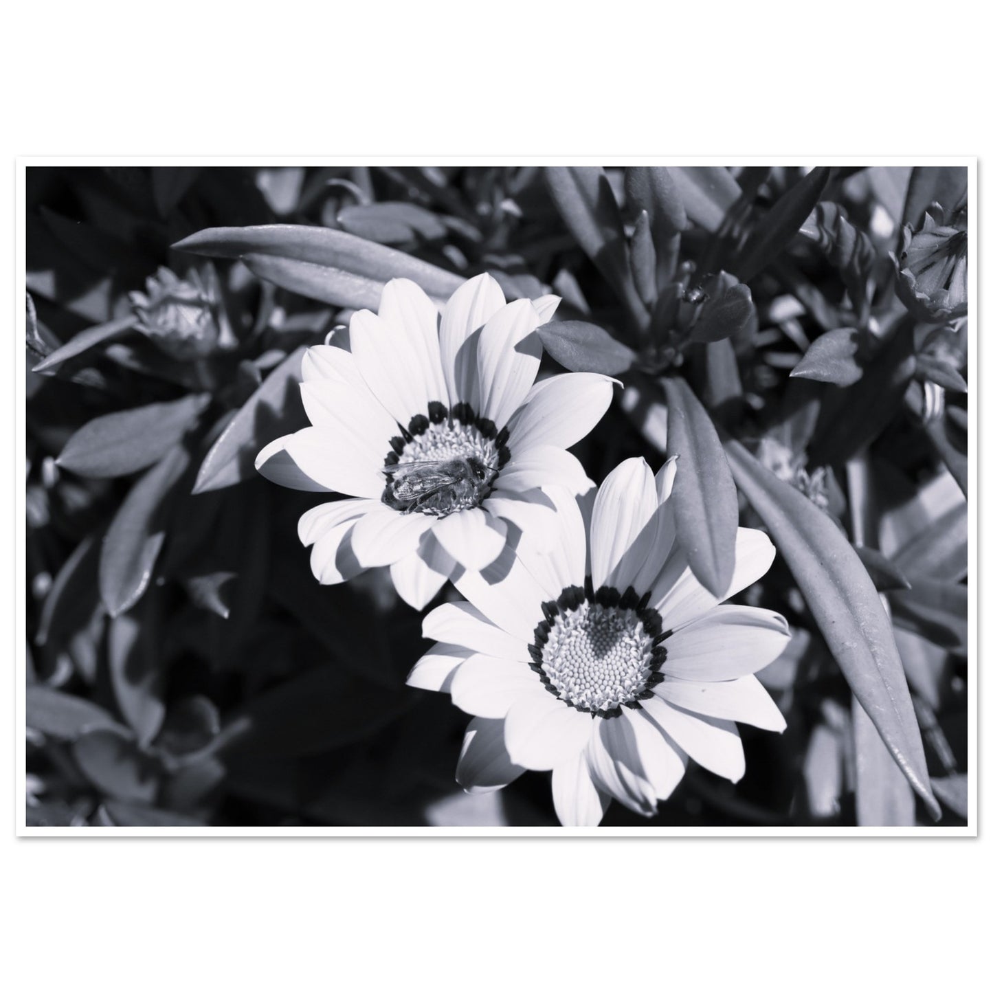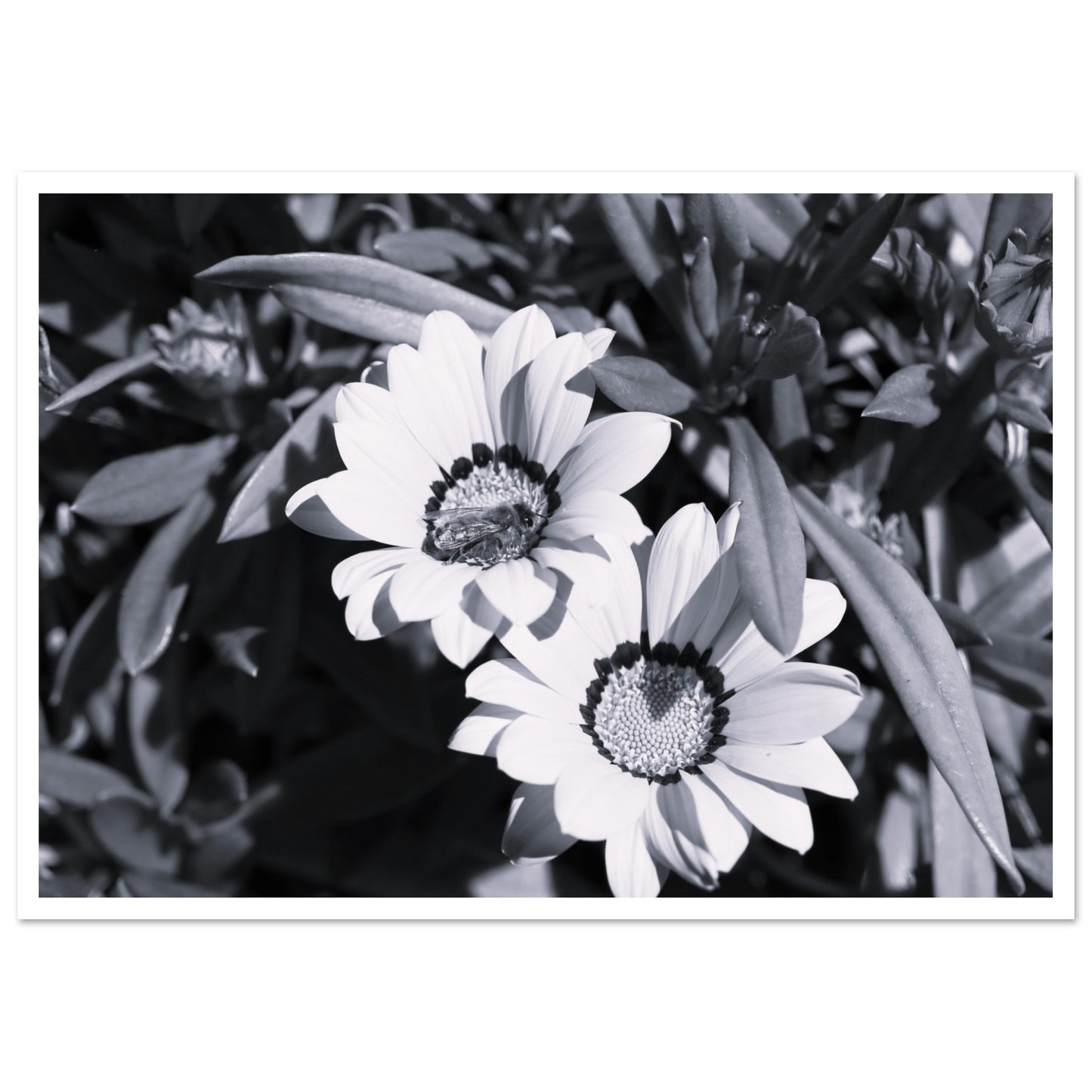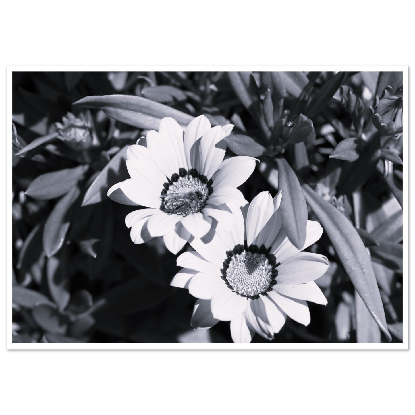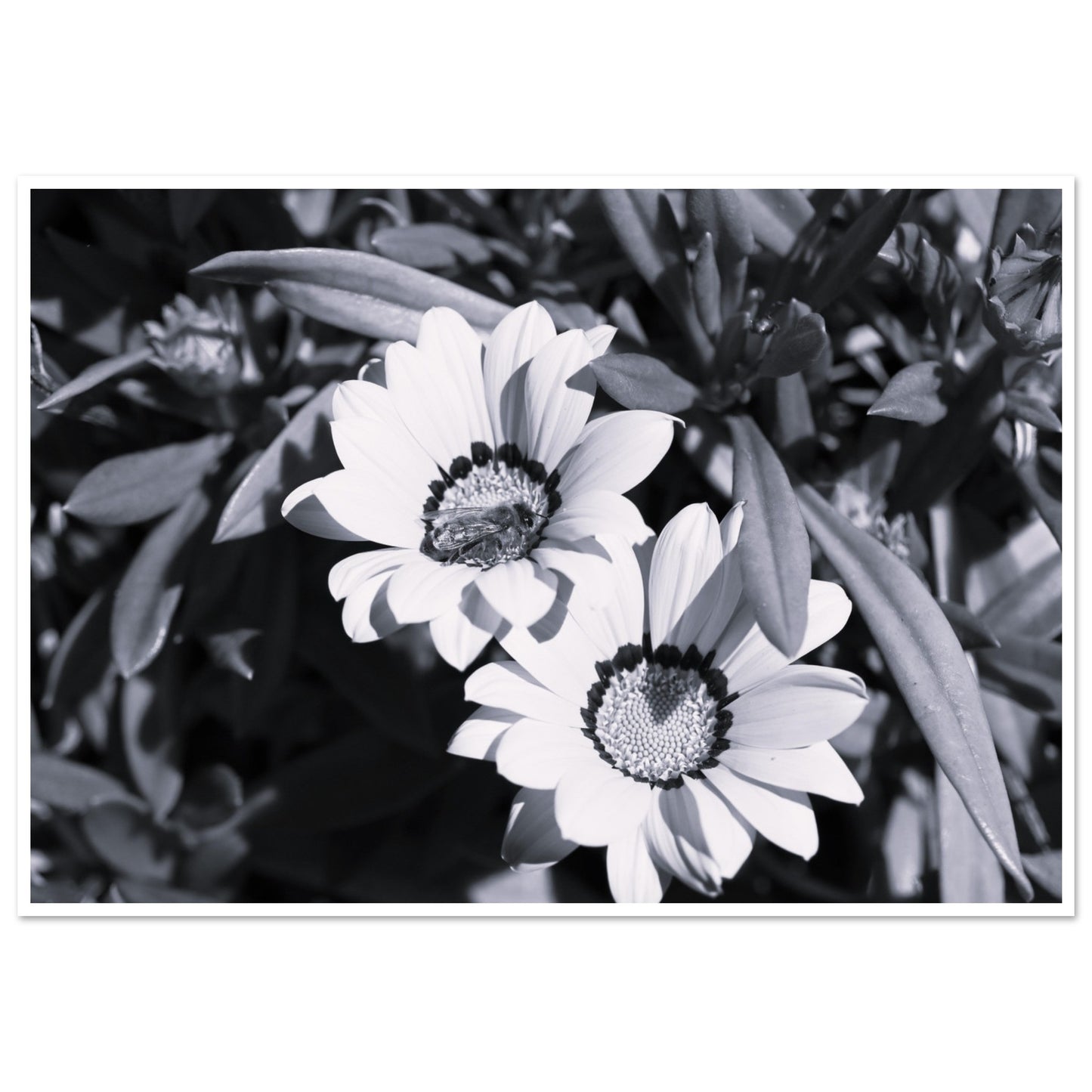Foraging bee on spring flowers - Black & White - Premium Matte Paper Poster