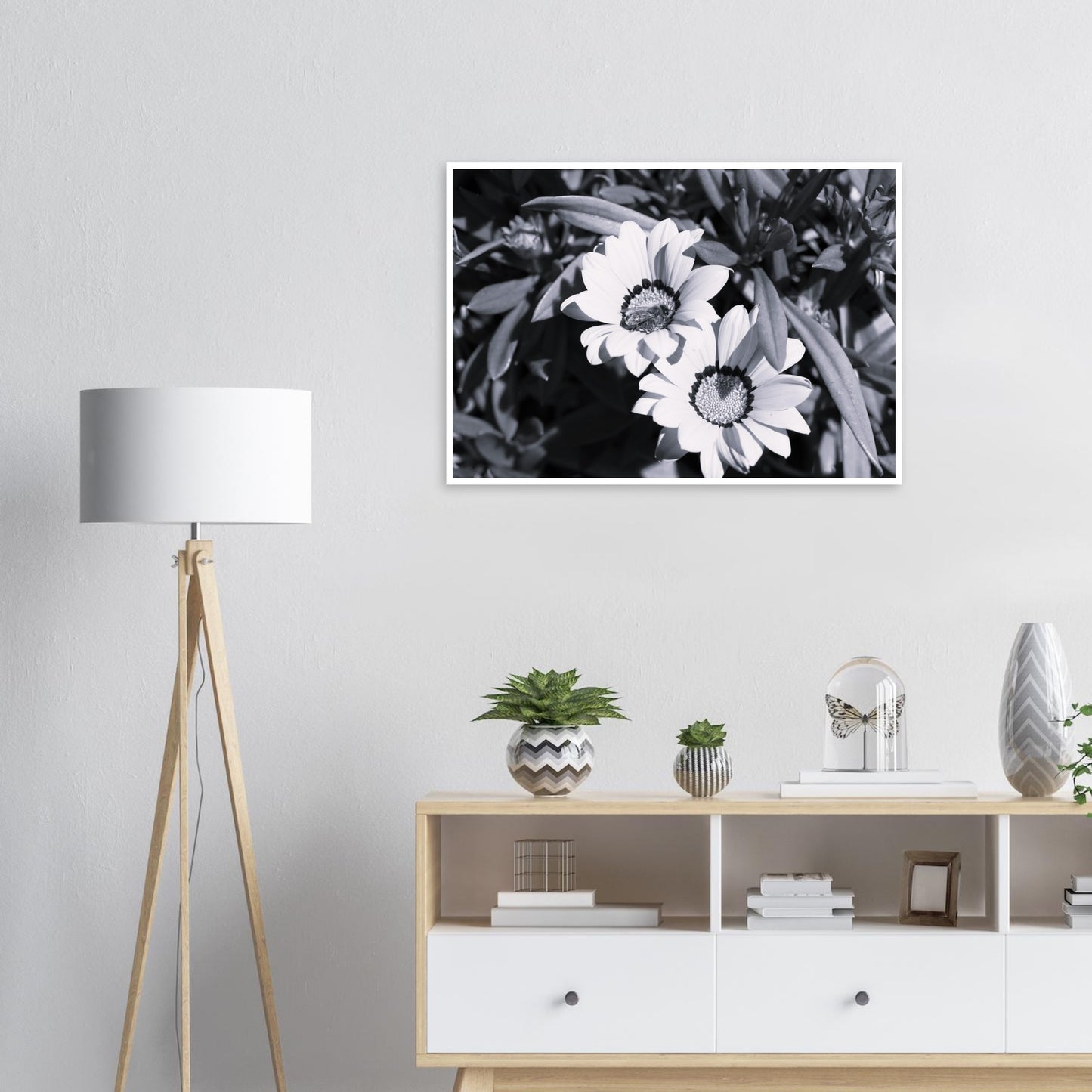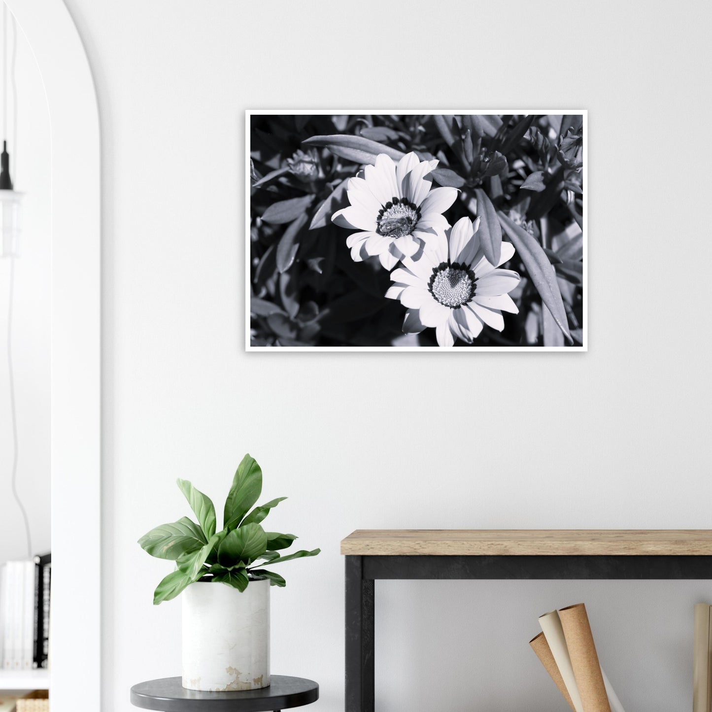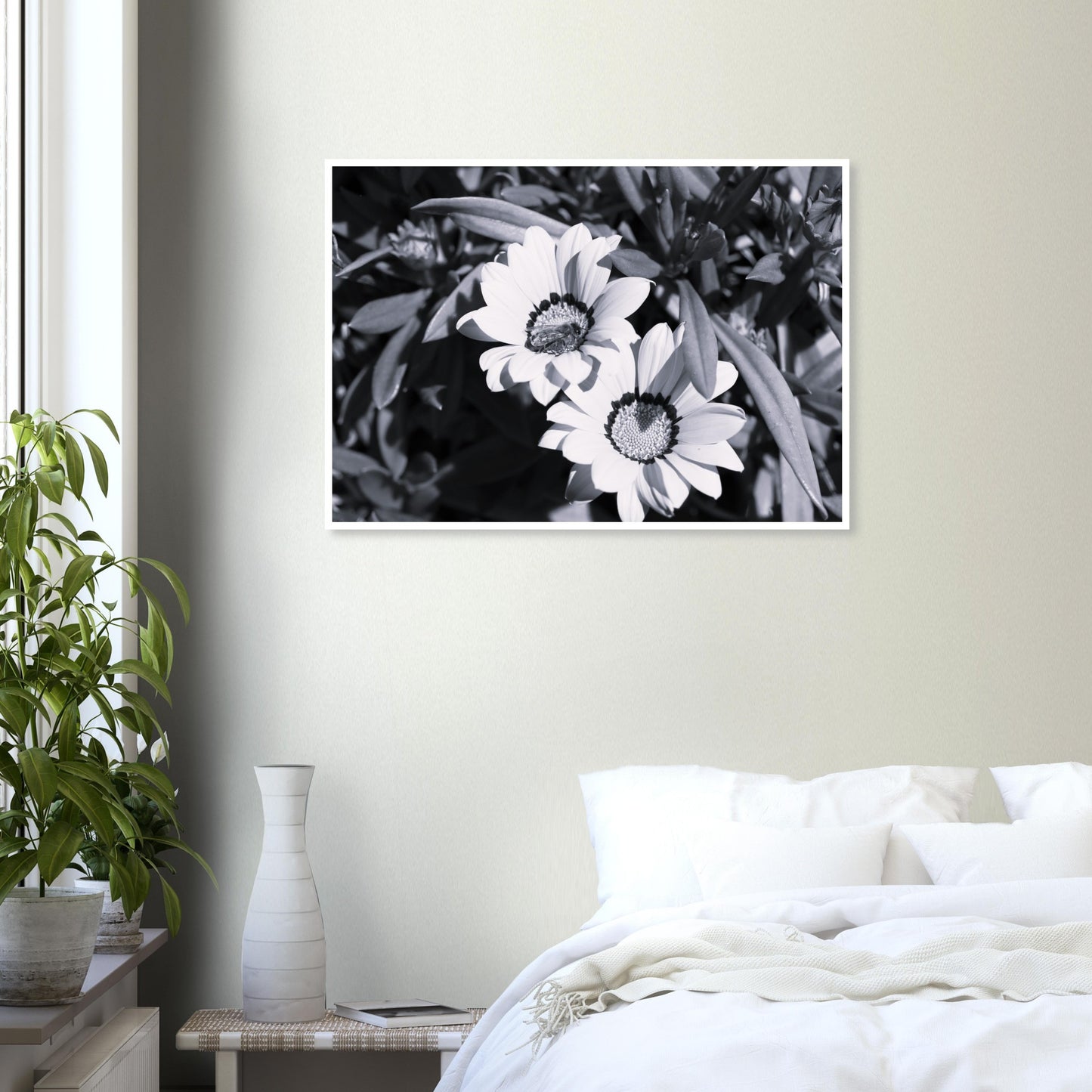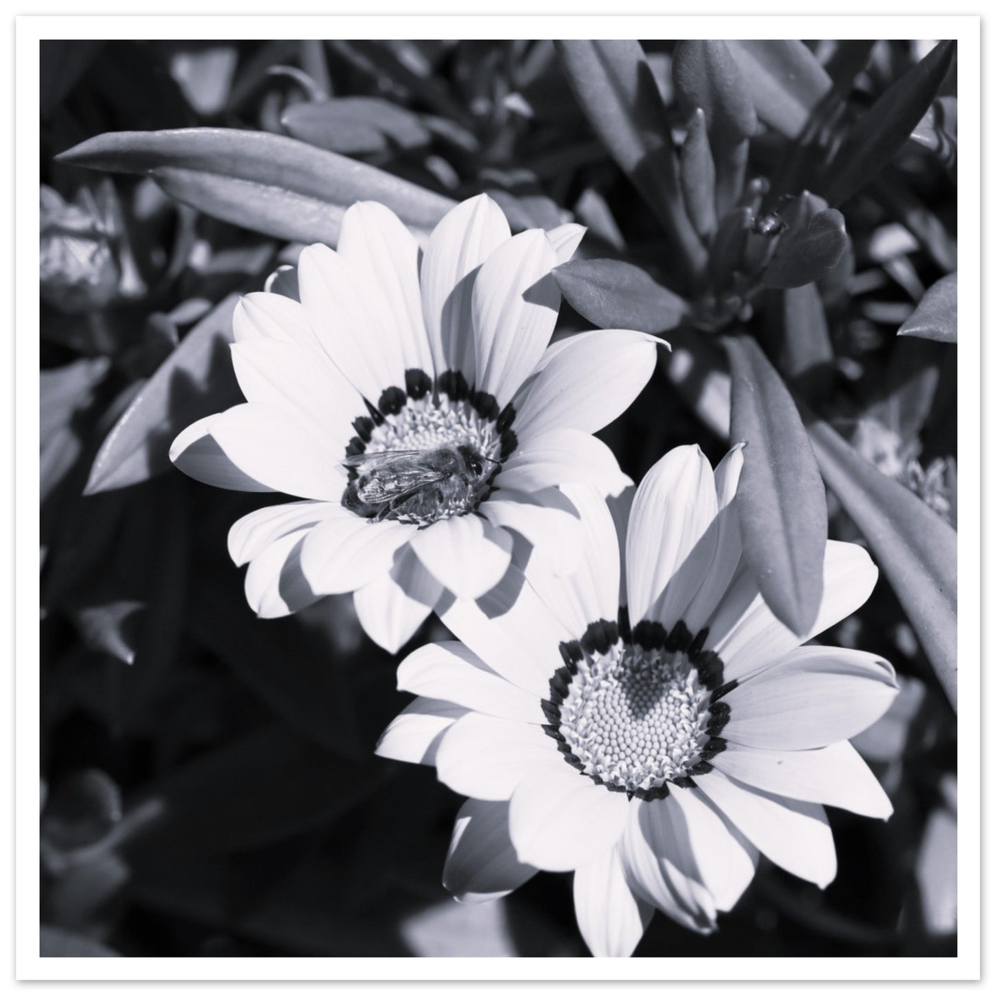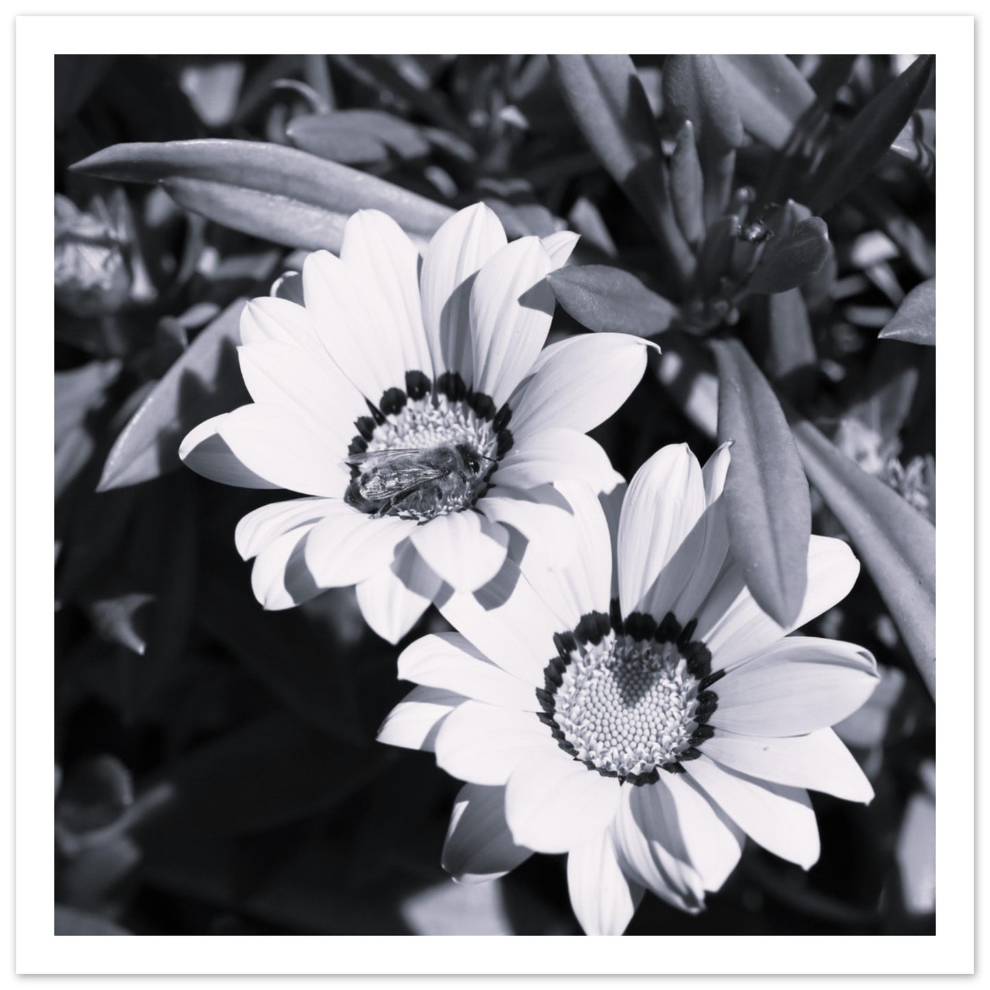 Foraging bee on spring flowers - Black & White - Premium Matte Paper Poster