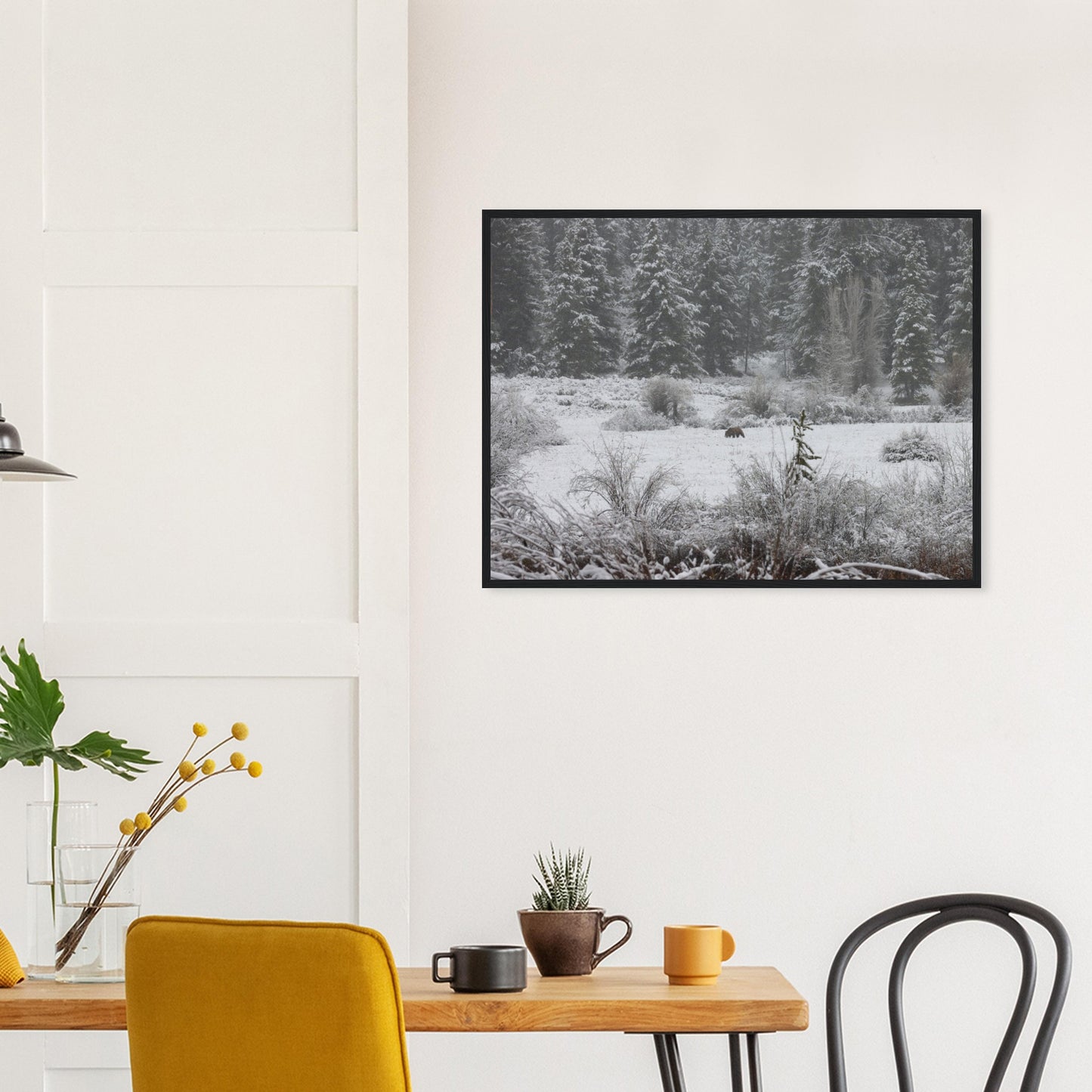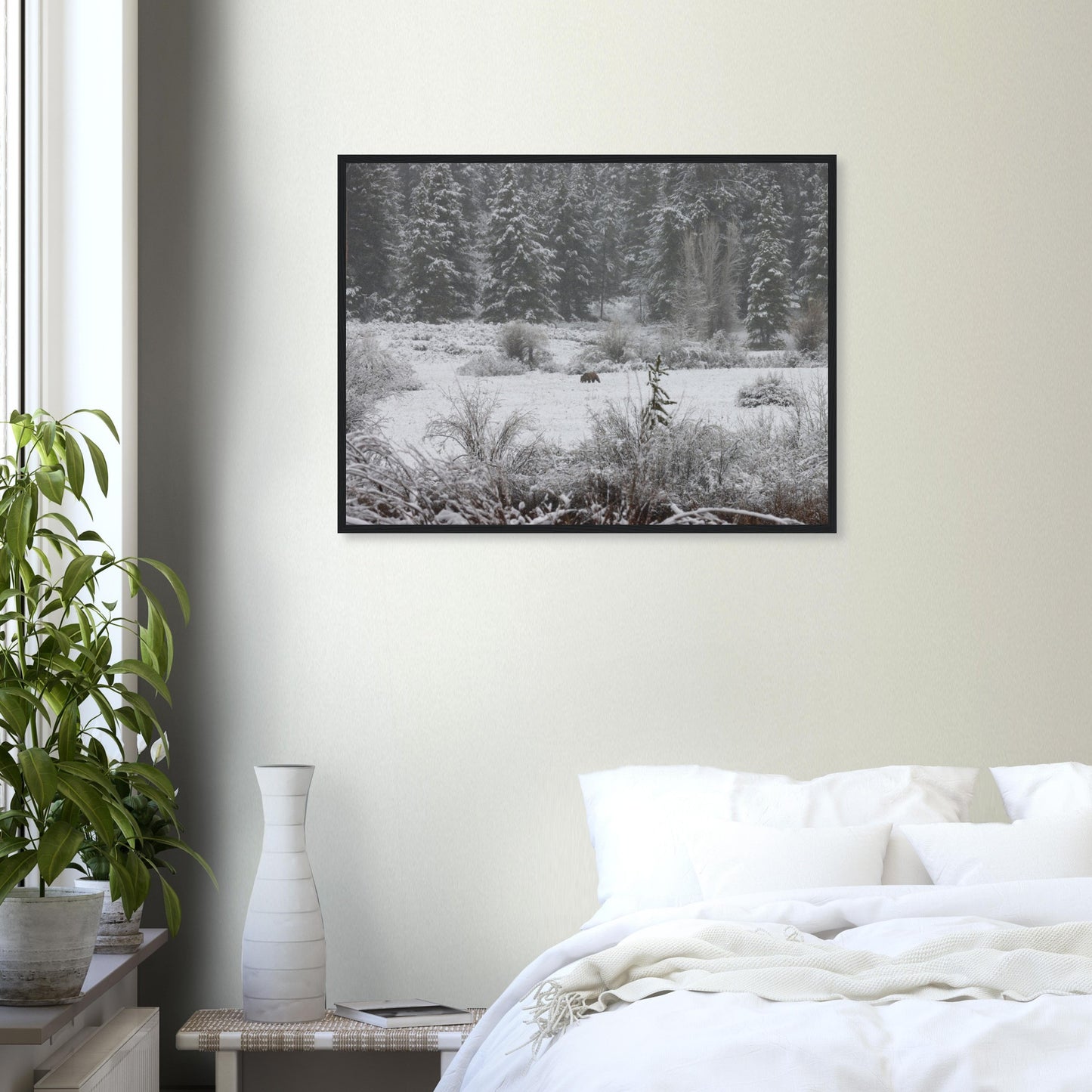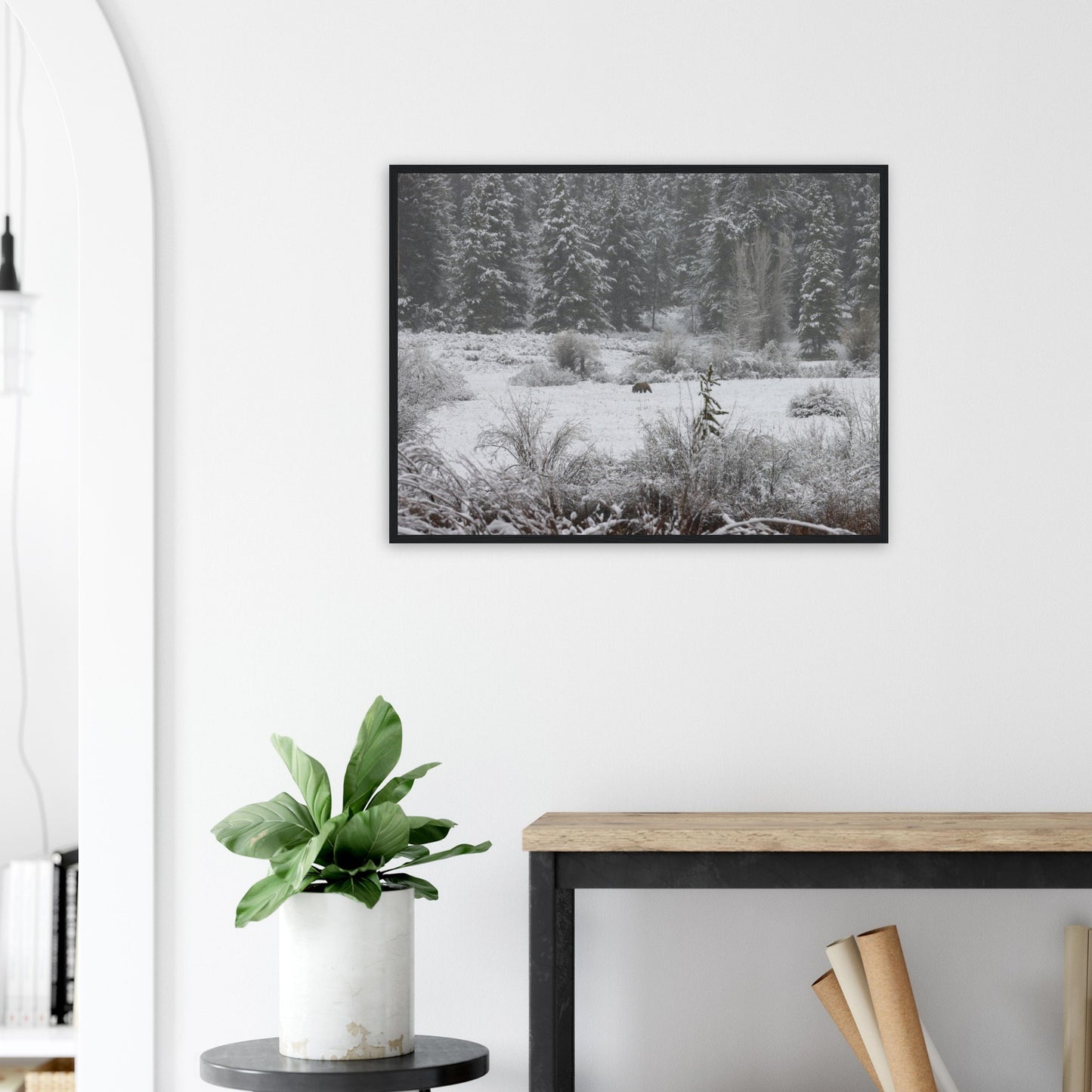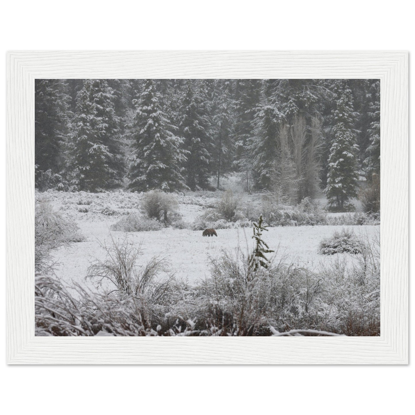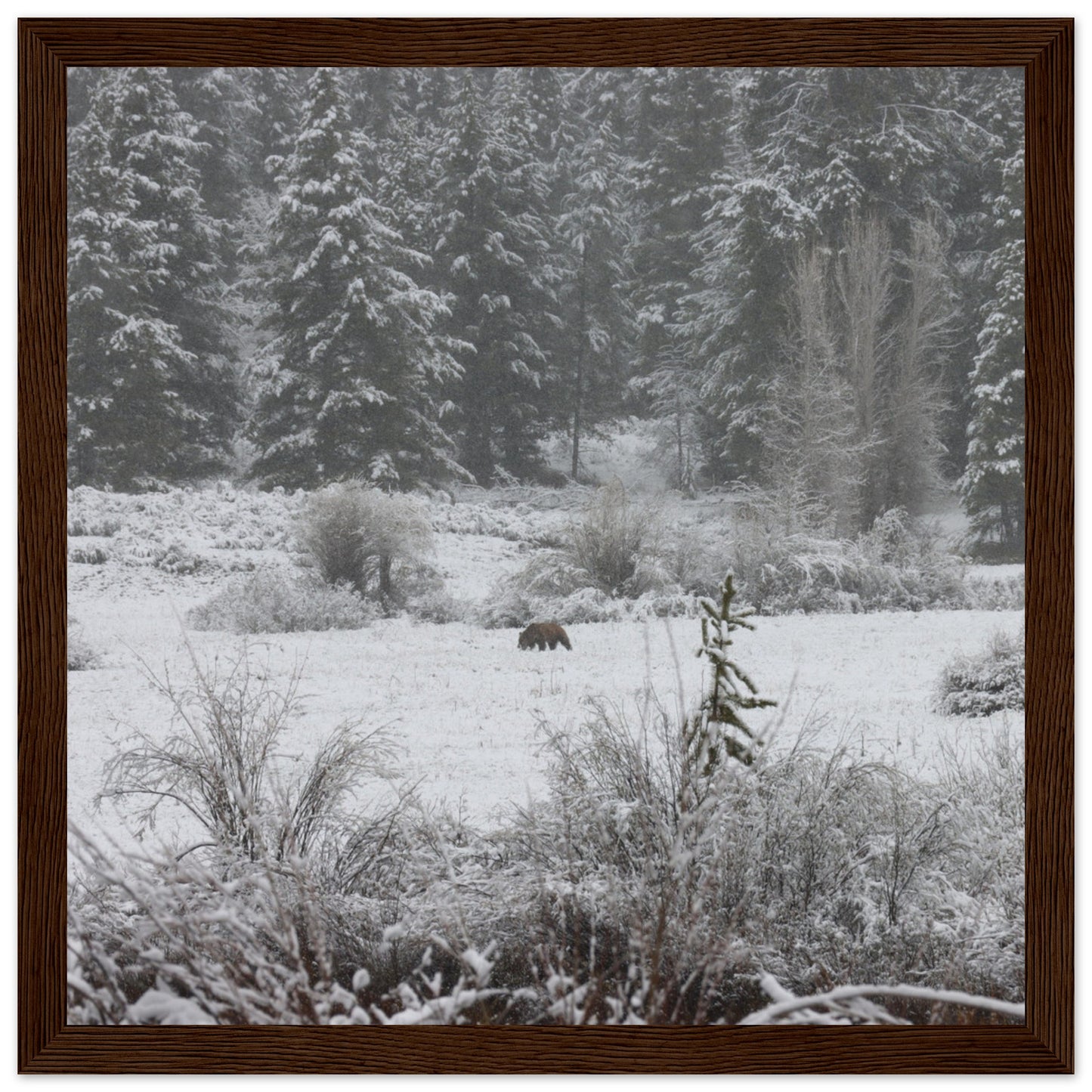 Grizzly bear on snowy day - Premium matte paper poster with wooden frame