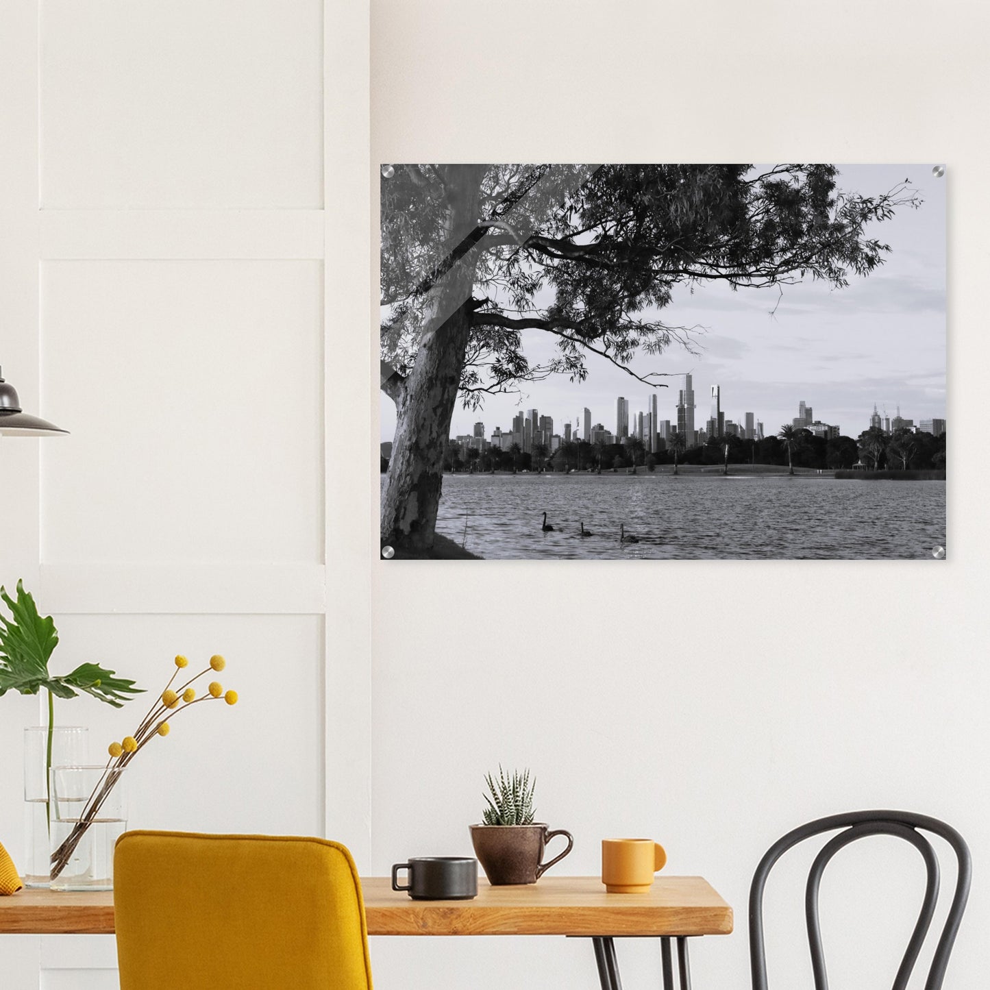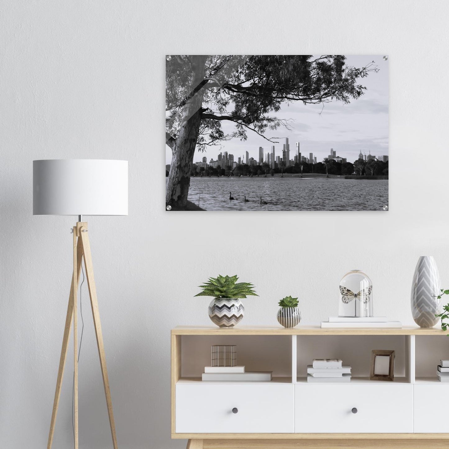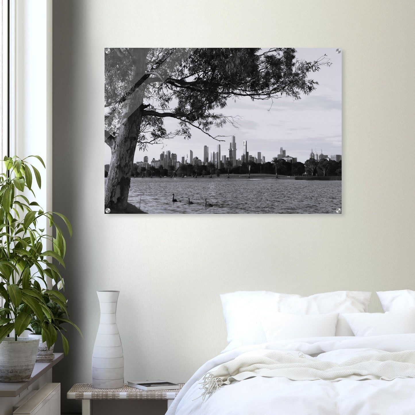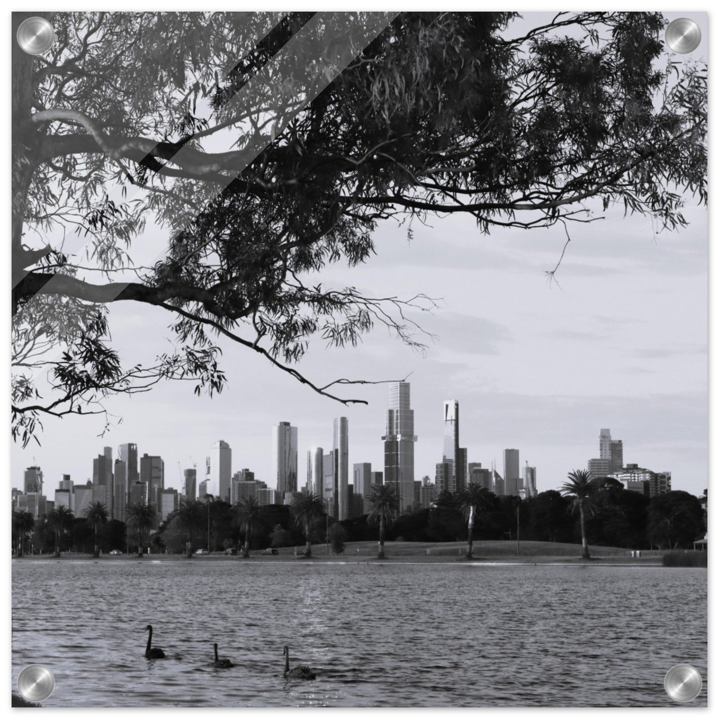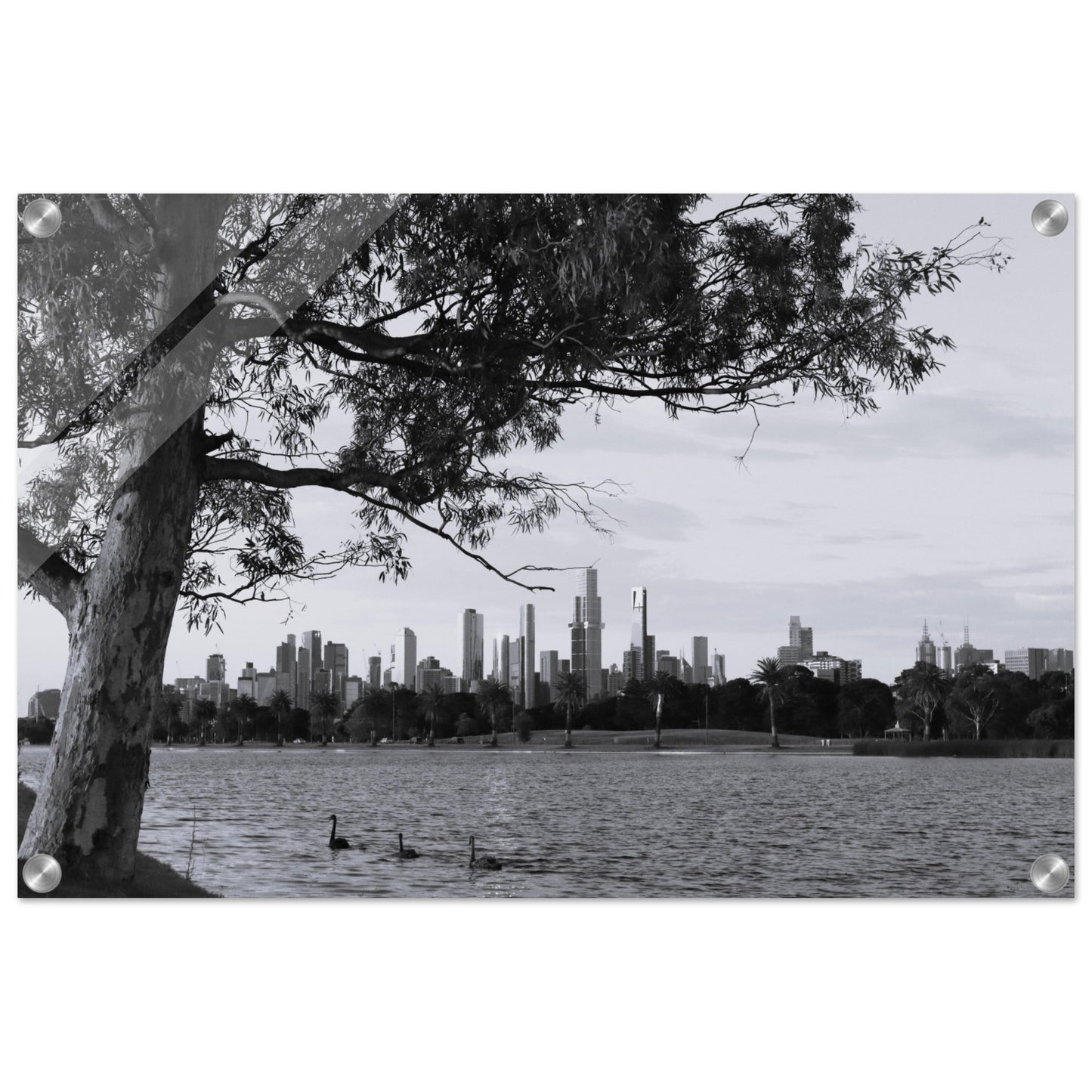 Melbourne skyline at dusk, Albert Park Lake - Black & White - Acrylic prints (lightweight, shatterproof, and temperature-resistant, making them easy to mount on your walls.)