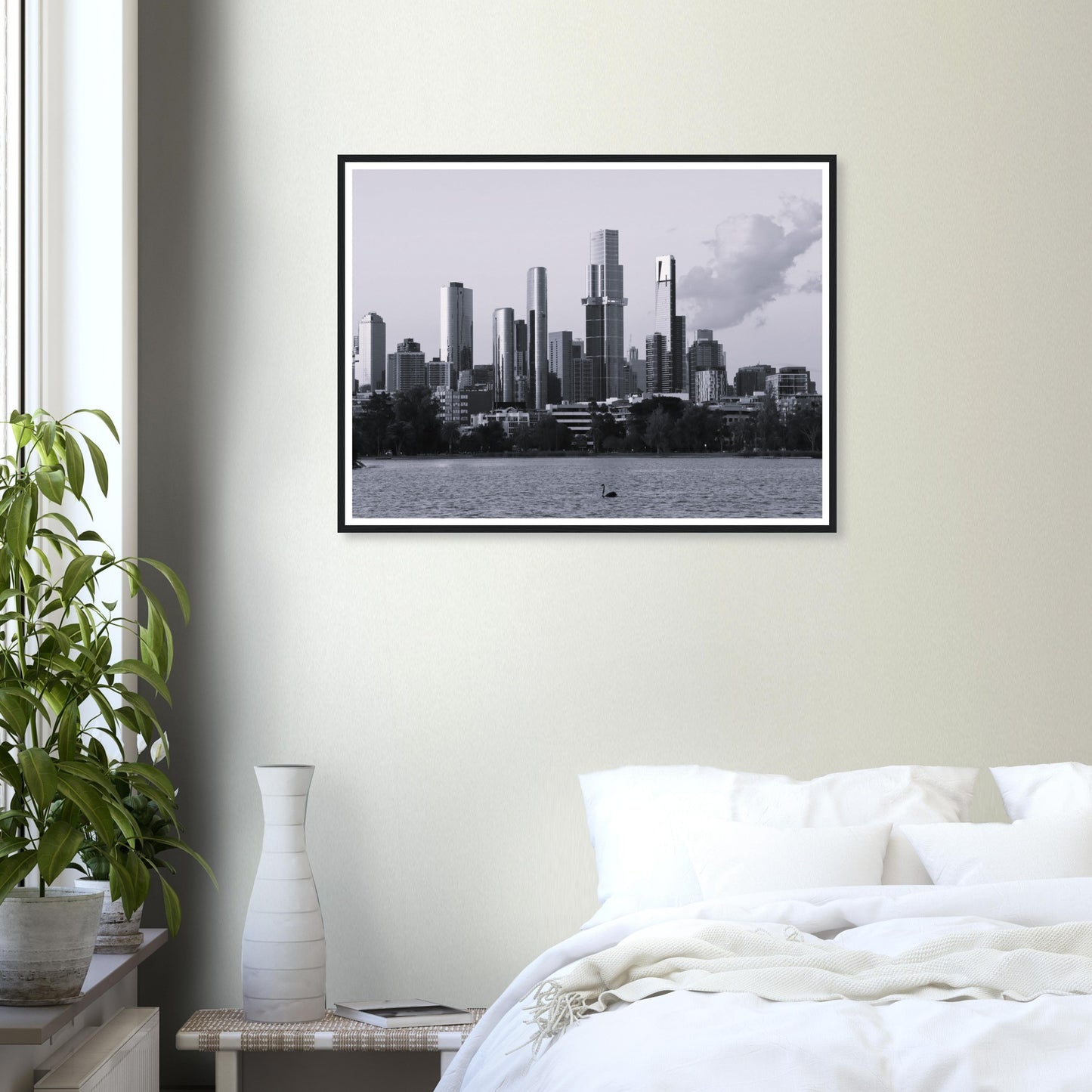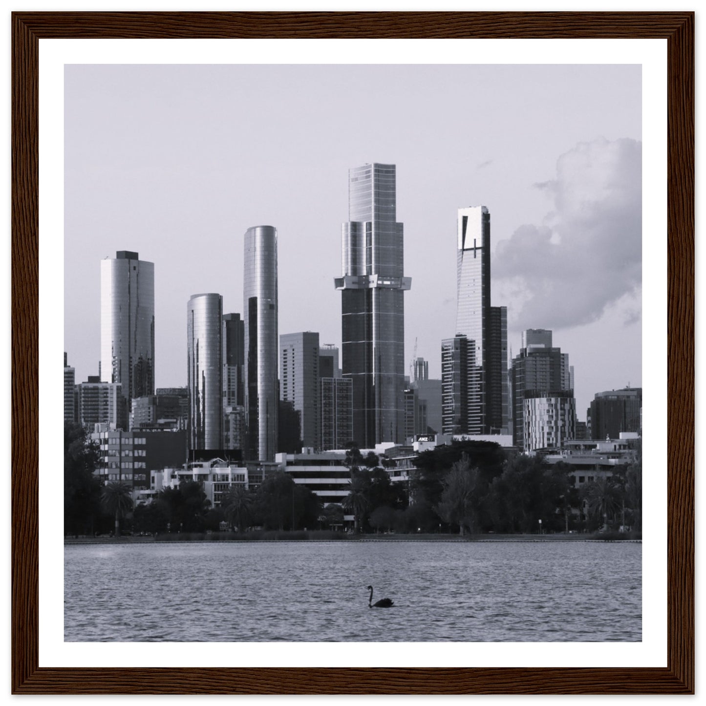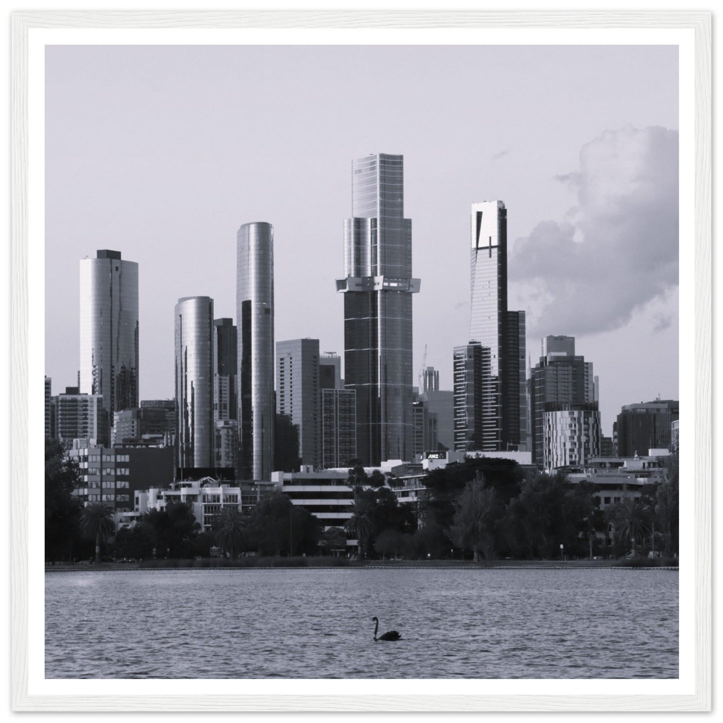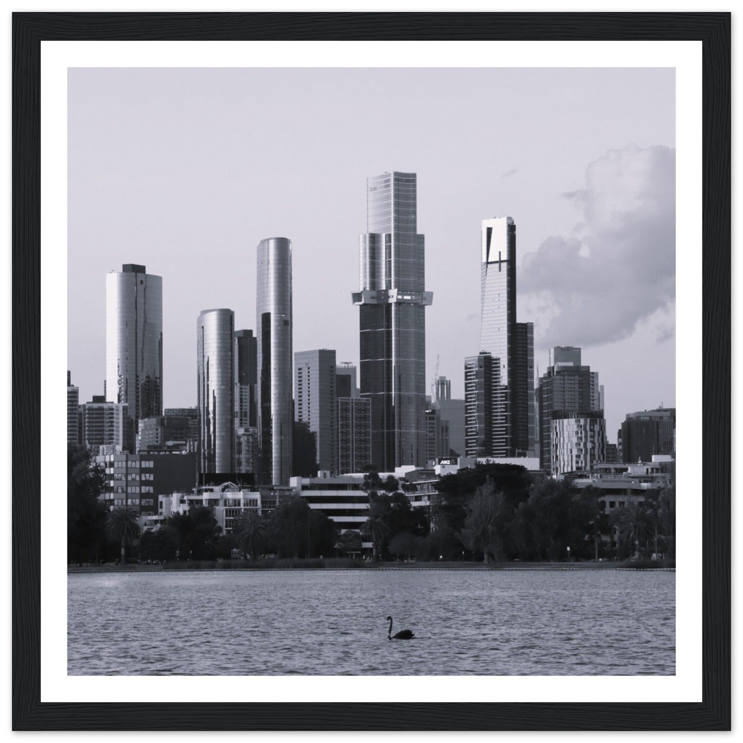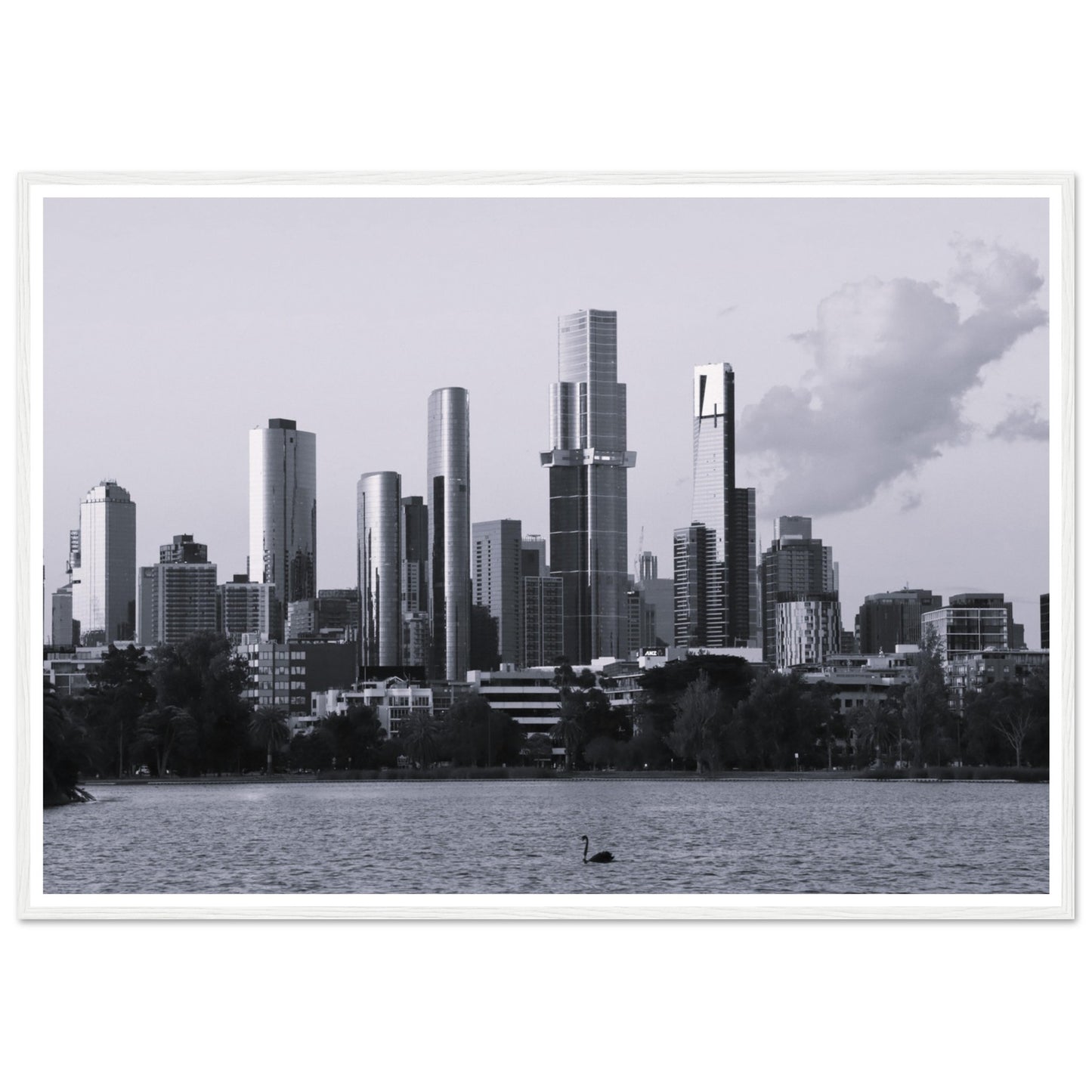 Melbourne skyscrapers by the water (B&W) - Premium Matte Paper Wooden Framed Poster