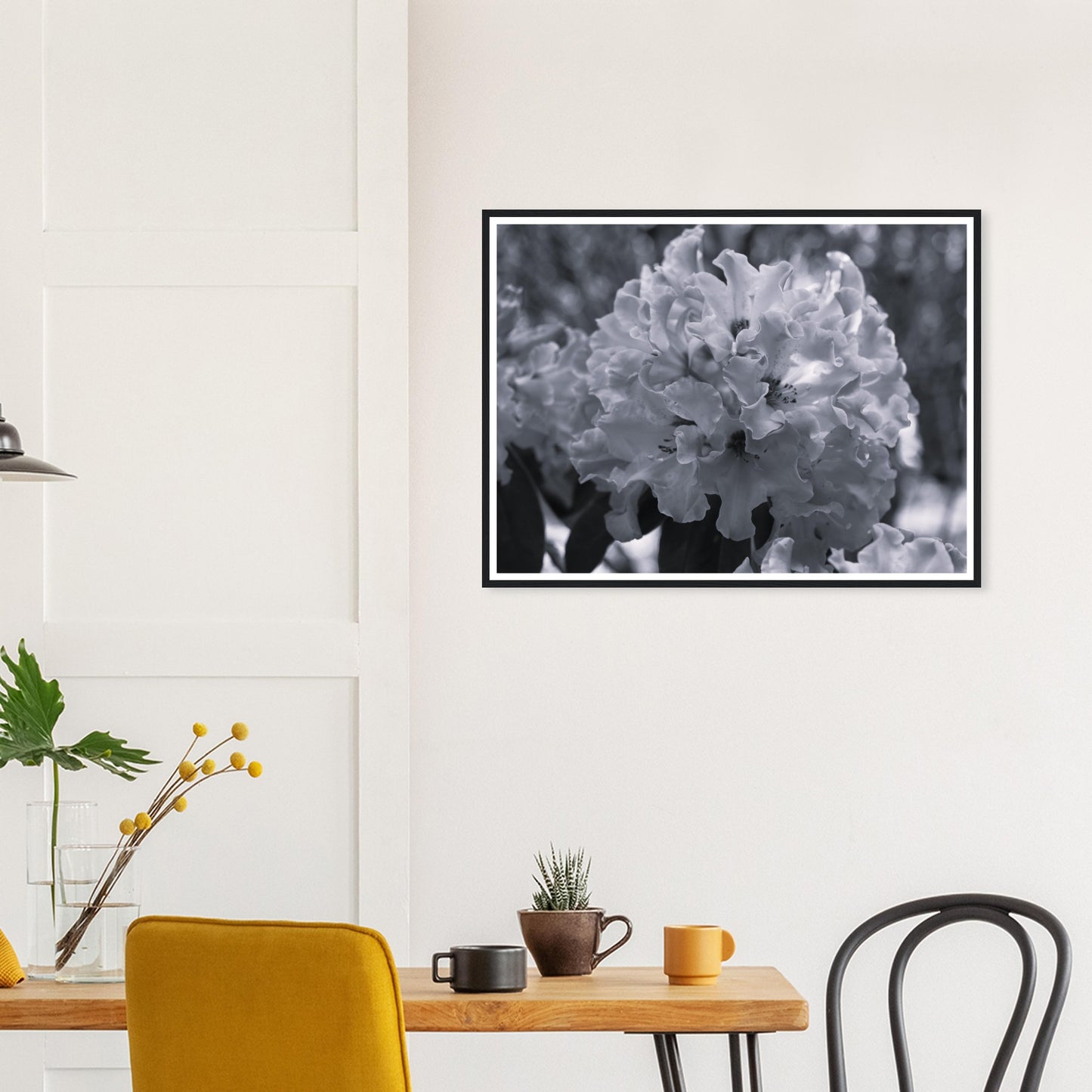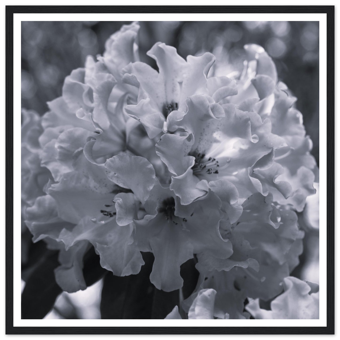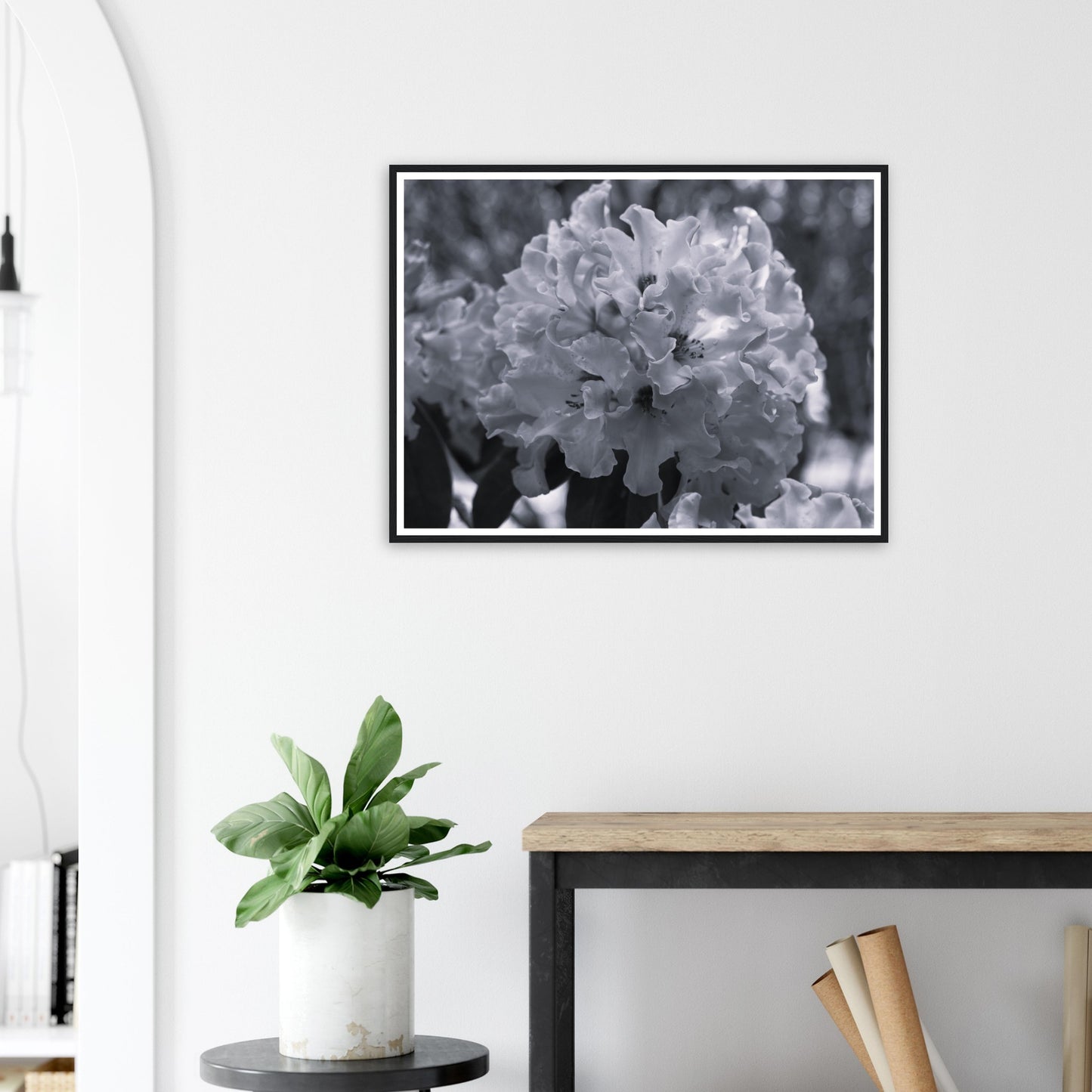 Pink ruffly rhododendrons in spring - Black & White - Premium matte paper poster with wooden frame