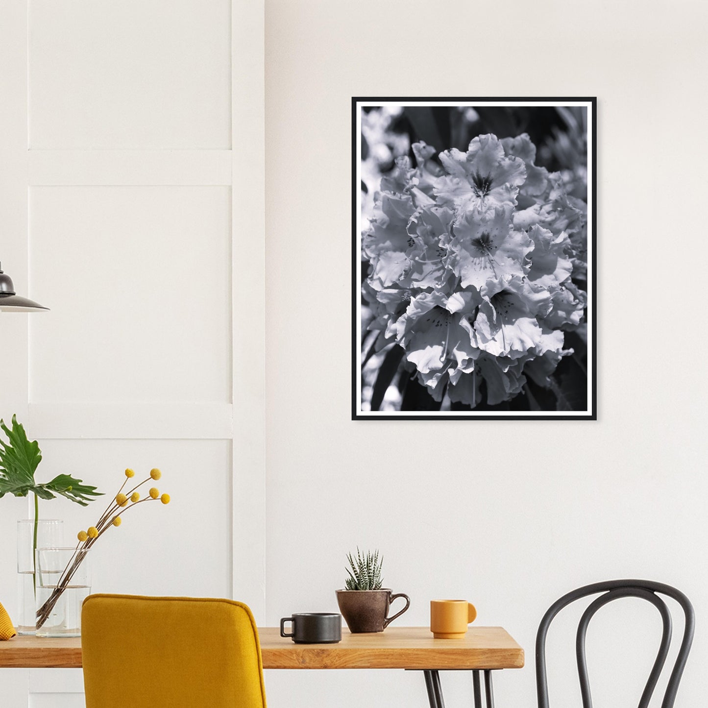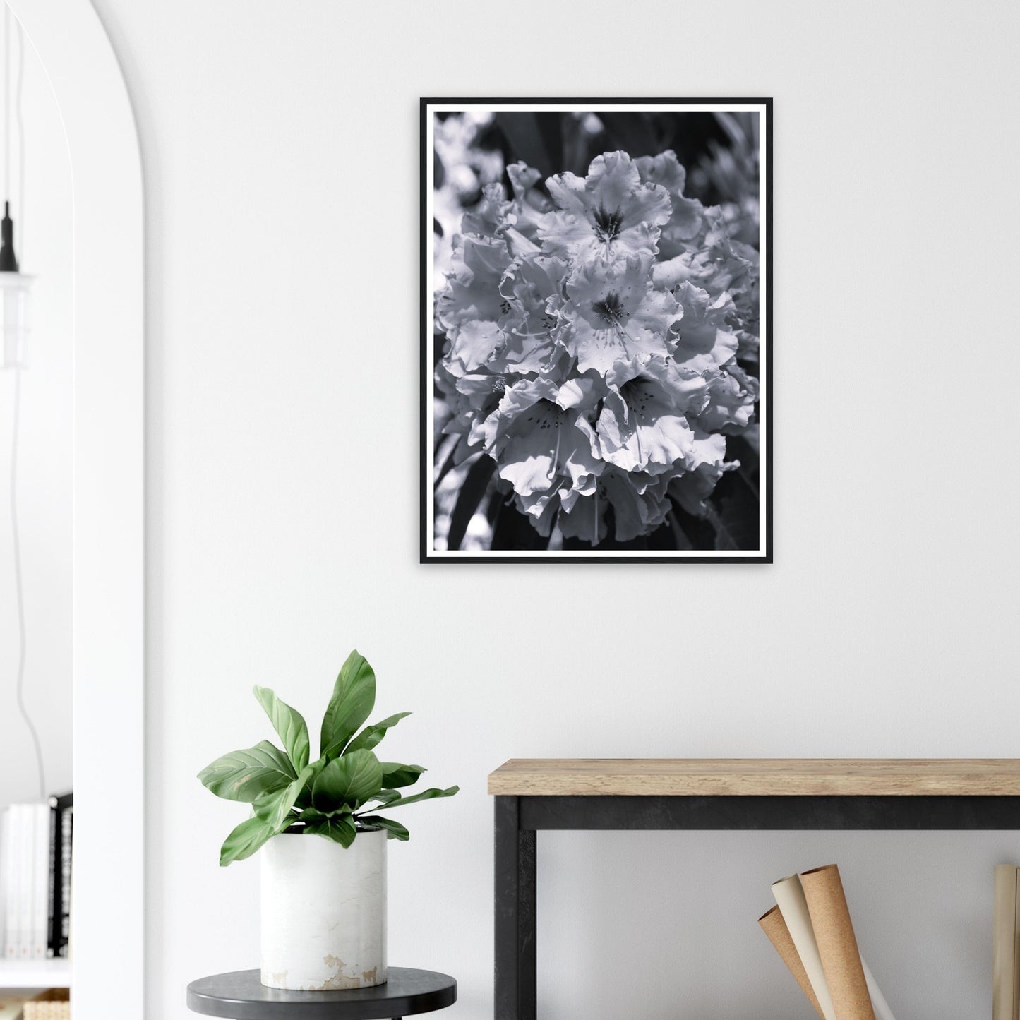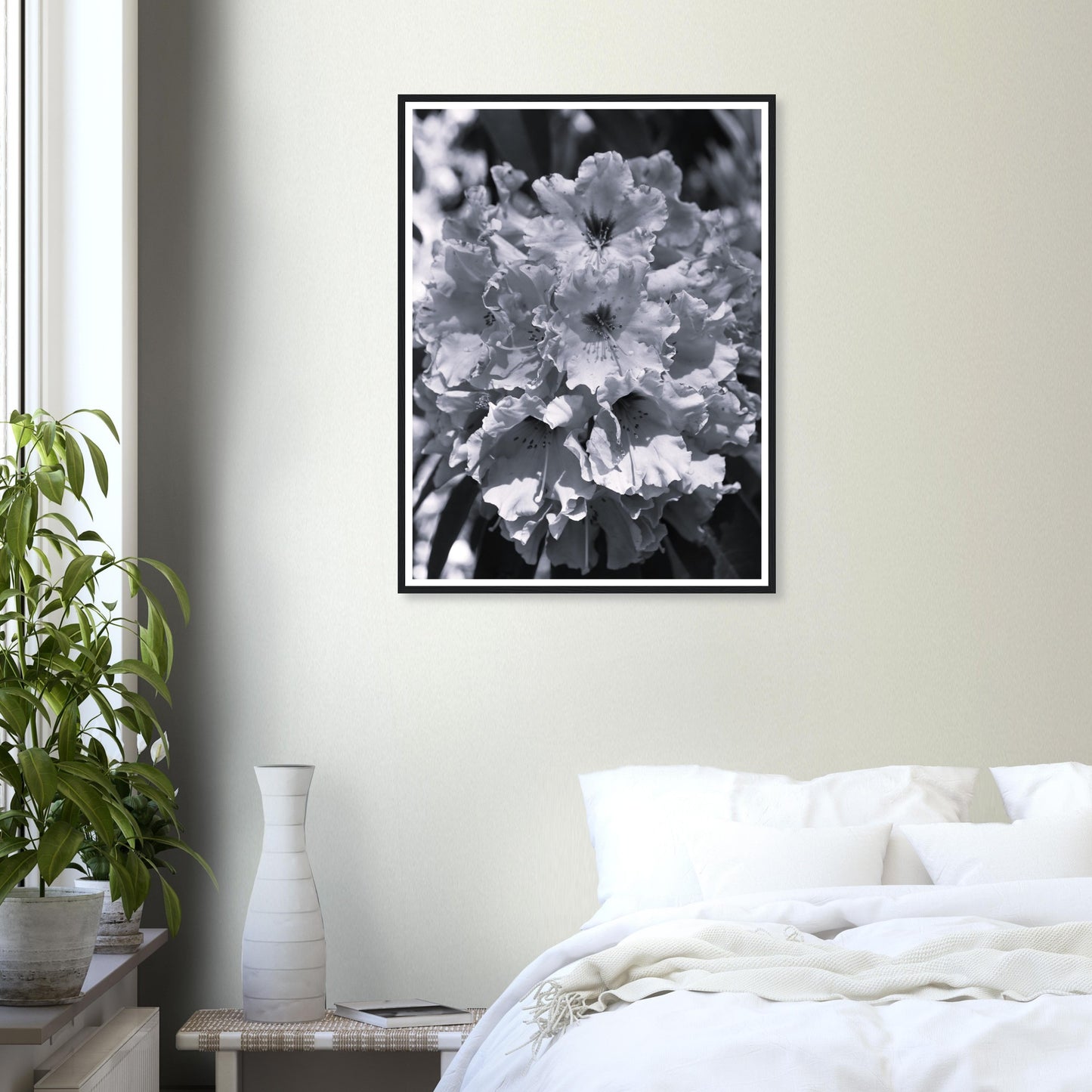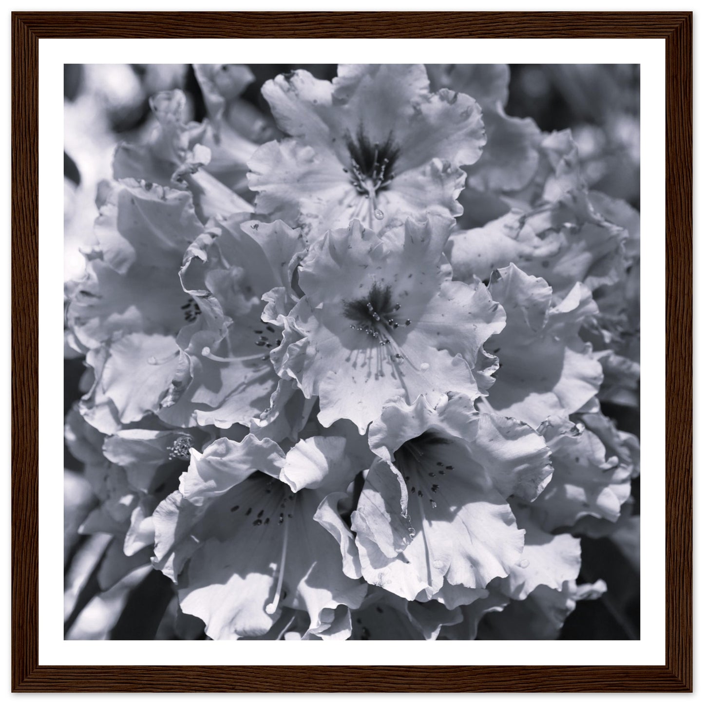 Pink ruffly rhododendrons in bloom (B&W) - Premium Matte Paper Wooden Framed Poster