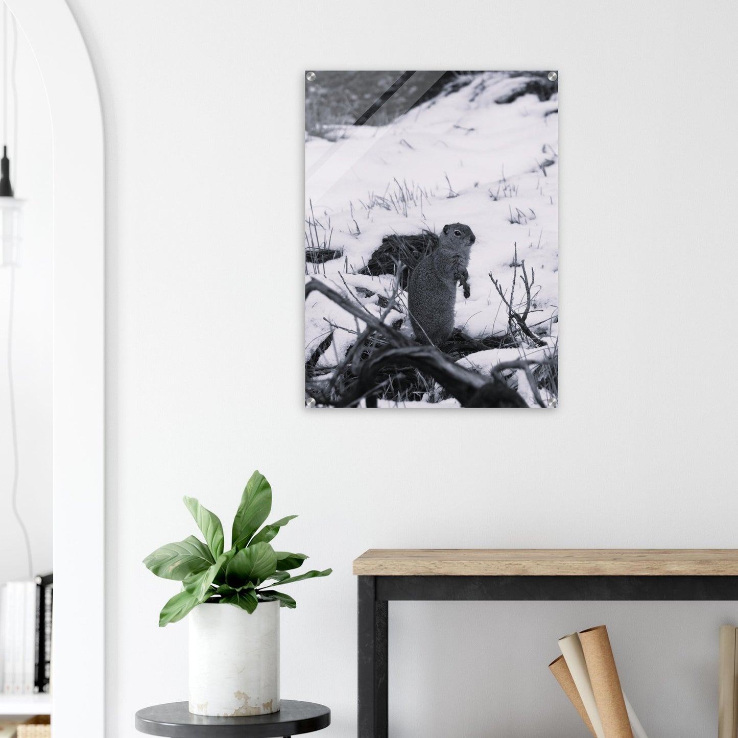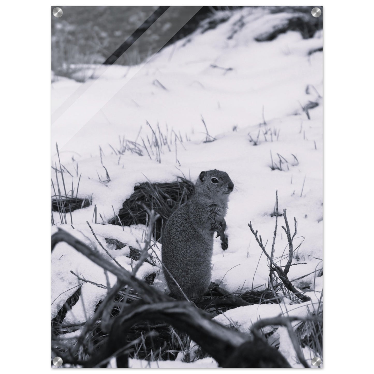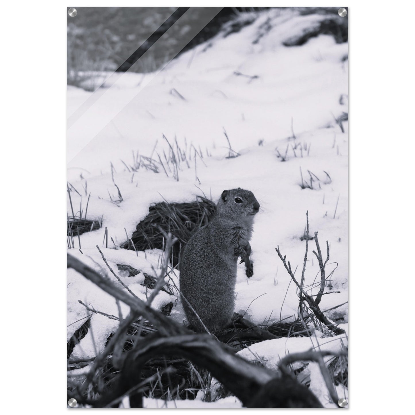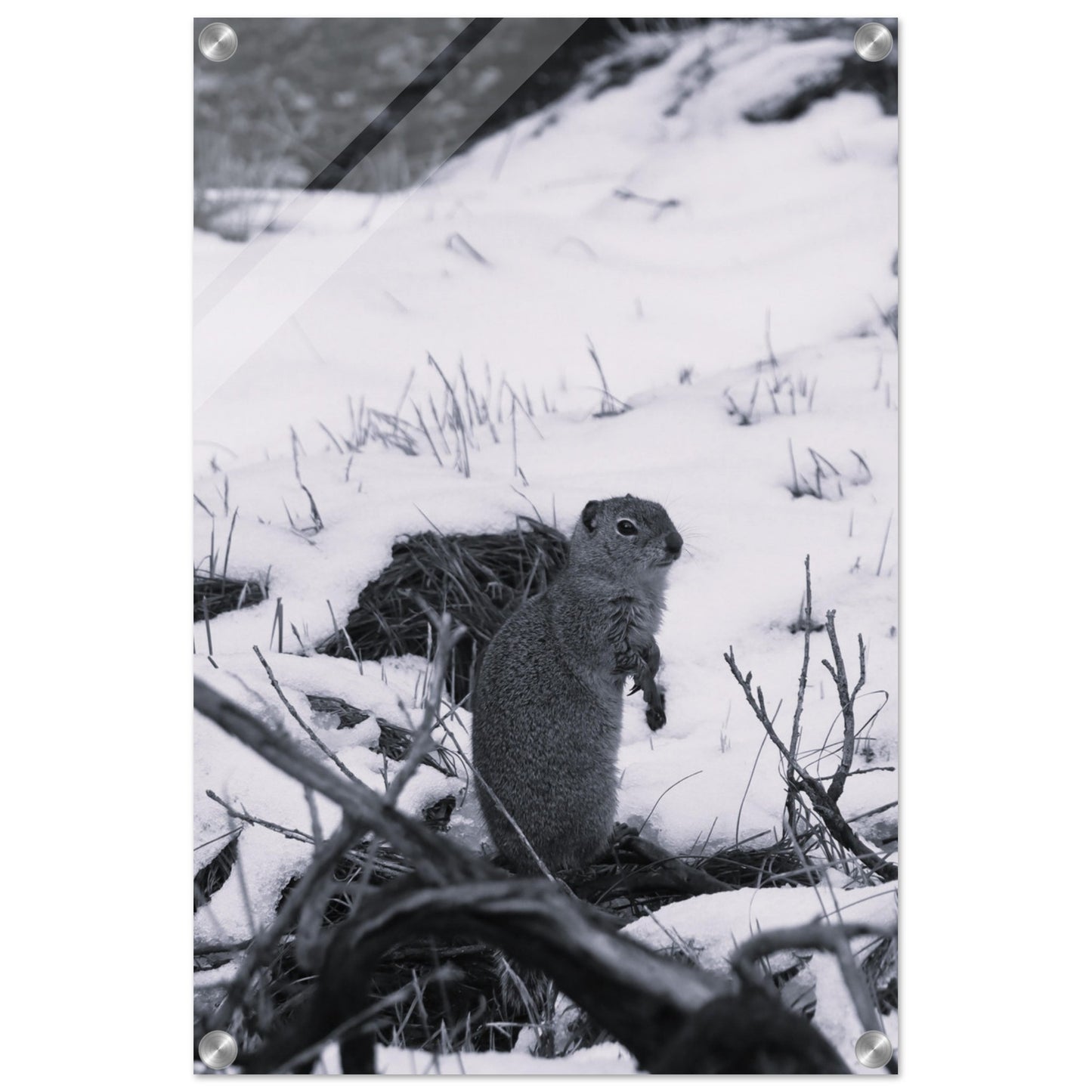 Squirrel in the snow - Black & White - Acrylic print (lightweight, shatterproof, and temperature-resistant, making them easy to mount on your walls.)