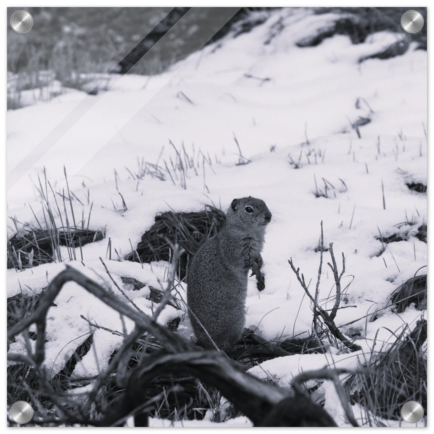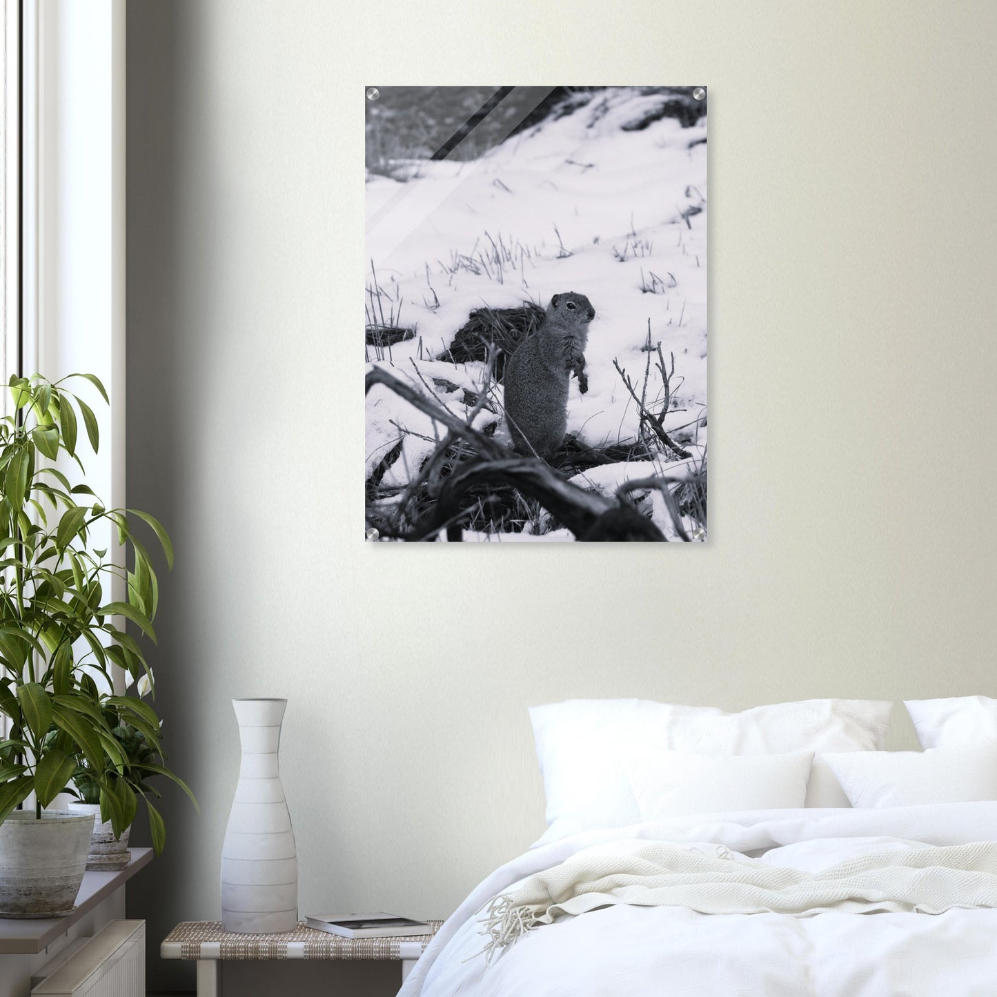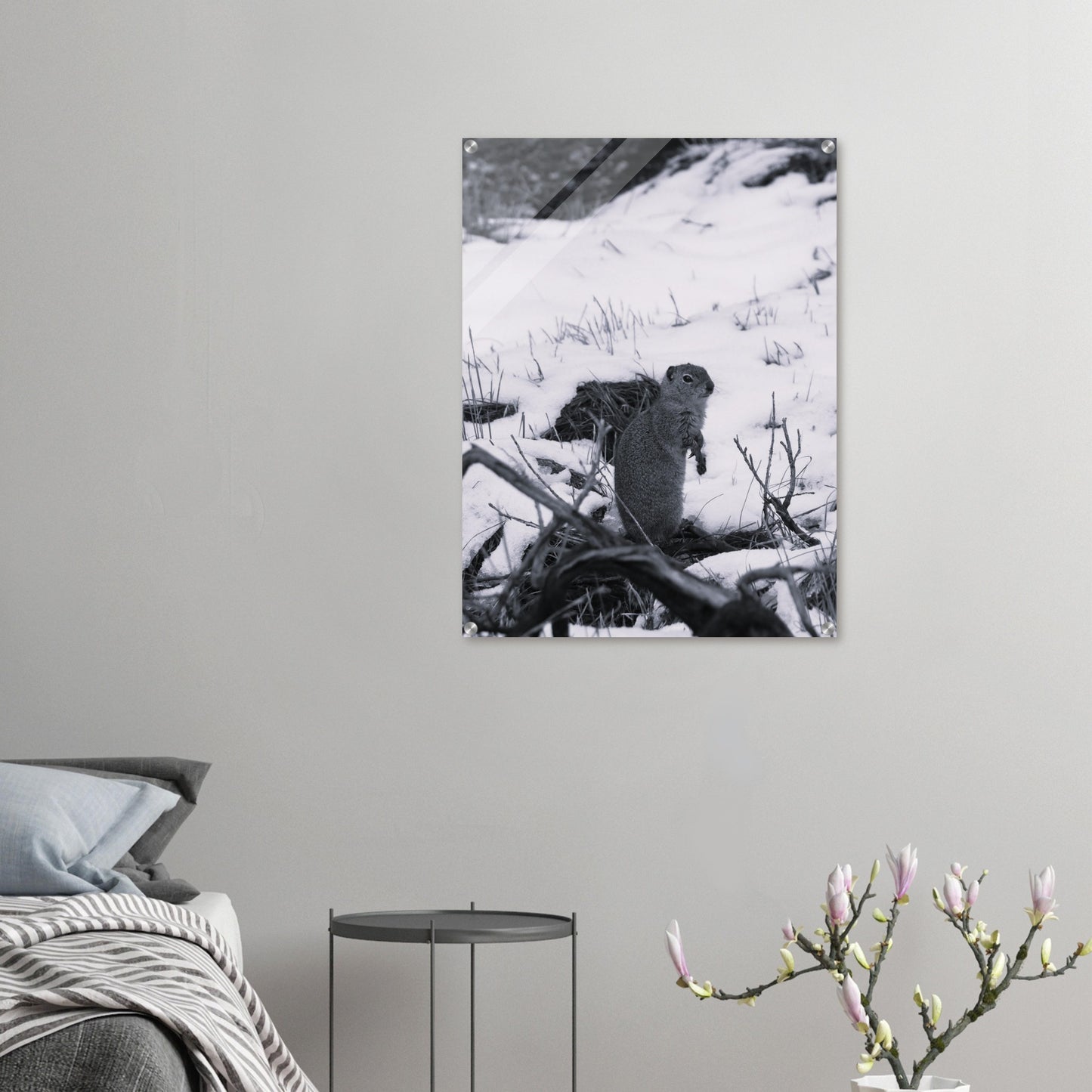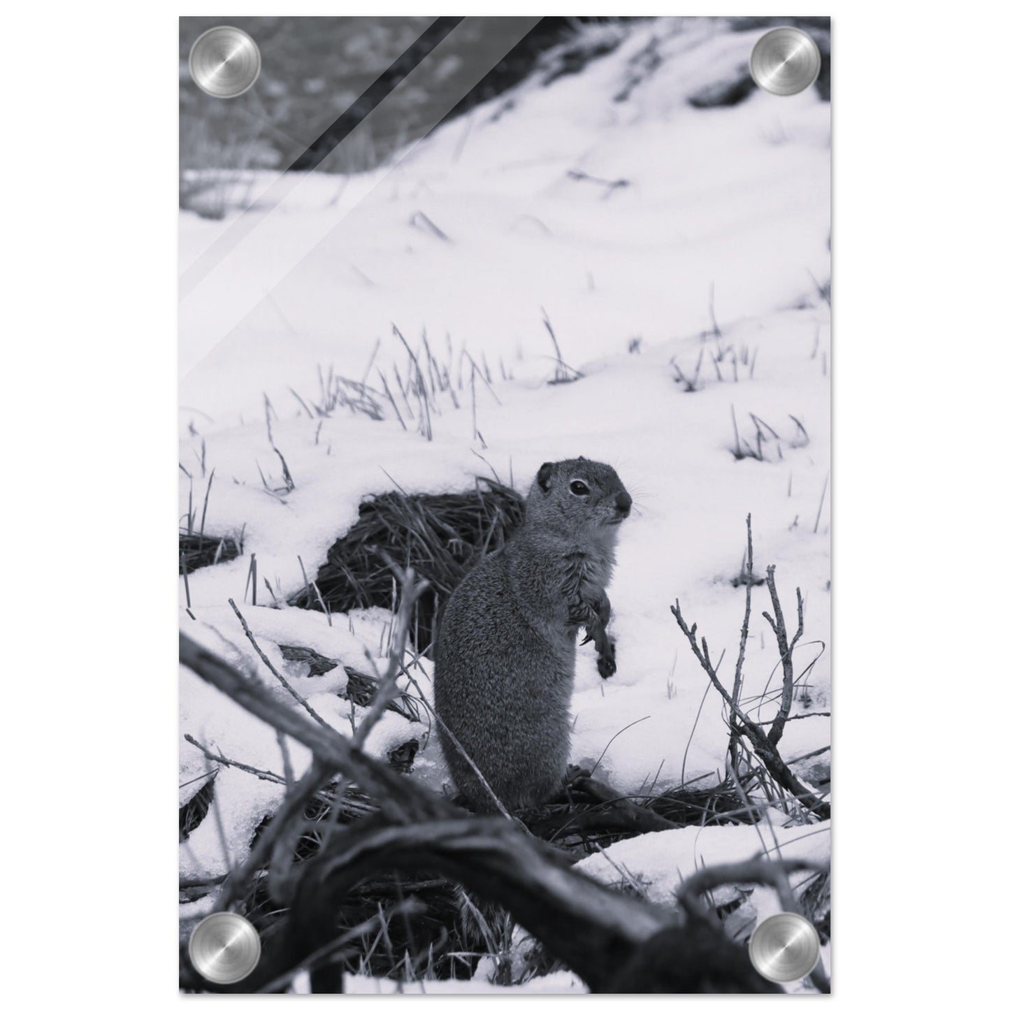 Squirrel in the snow - Black & White - Acrylic print (lightweight, shatterproof, and temperature-resistant, making them easy to mount on your walls.)
